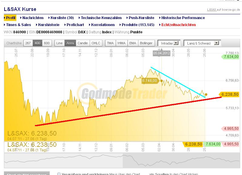 Sthenelos Juli 1, 2012 · bearbeitet Juli 1, 2012 von Sthenelos Richtig. Und die Probleme werden auch in 5 Jahren nicht gelöst sein. Bekanntlich ist das aber an der Börse zweitrangig. Alle Probleme jetzt waren im Prinzip auch schon im Frühjahr bekannt, als der Dax die 7200 anbumste. Portugal+Irland gehts besser, GR unverändert, in Ita greifen langsam die Reformen, Spanien unverwändert. An den Börsen will Geld verdient werden, überwiegend mehr mit steigenden als mit fallenden Kursen. Diese Beruhigungspille jetzt kann den Dax locker auf über 7000 Punkte hieven. Gier und Angst. M.A. ist jetzt bis Ende des Jahres oder zumindest für ein paar Monate die Gier der Steuermann. Chart: der Abwärtstrend seit März ist nun defintiiv gebrochen, der Aufwärtstrend seit letztes Jahr September ist und bleit intakt. Diesen Beitrag teilen Link zum Beitrag