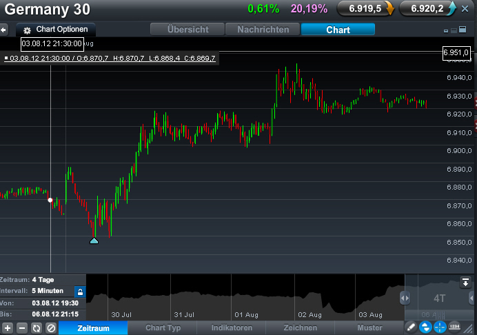 35sebastian August 7, 2012 Technische Analyse eines Anlegers: ne Pille kann man auch in den After einführen und sie wirkt *grins*. Der Rücksetzer war zu erwarten, die Lage bleibt im Moment noch bullish. Hatte die Tiefs genutzt um massiv zu scalpen, Intraday ist aber eine Prognose schwer - mich würde es aber nicht wundern, wenn wir 6750 heute nochmal sehen. Gefühlt 6650, dann Marsch auf 7000. Aber noch eindeutig bullish für die nächste Zeit - nach Chart und Indikatoren. Gestern 6650 bis 6570, heute fast schon 6900. Wahnsinn, ordentliche Vola, politsche Börsen... nicht falsch, bin noch mit 50 % vom Aktiendepot insgesamt investiert. 30 % muss noch raus. Die Party geht jetzt aber vermutlich erst richtig los! 7400 wir kommen, jetzt wird Reibach gemacht und maßlos übertrieben, ich freue mich schon richtig drauf!! BP: ich gehe bei ca. 7000 (muss mir aber den Schart bei Zeit nochmal genauer anschauen) auch von einer Korrektur aus, innerhalb vom Aufwärtstrend. ich habe keine Nerven und auch keinen Geldbeutel, sondern ne Visa Platin Zustimmung. Lage bleibt ganz klar bullish. Könnte zwar kleine Rücksetzer geben, ich rechne aber ziemlich sicher damit, dass die 7000 fallen - und zwar sehr bald. Falls nicht, kann es eine kleine Korrektur innerhalb des Aufwärtstrends geben, aber der Druck der gerade im Markt da ist, nach oben, reicht locker für neue Jahreshochs. Jetzt werde ich nicht weiter stören. Diesen Beitrag teilen Link zum Beitrag