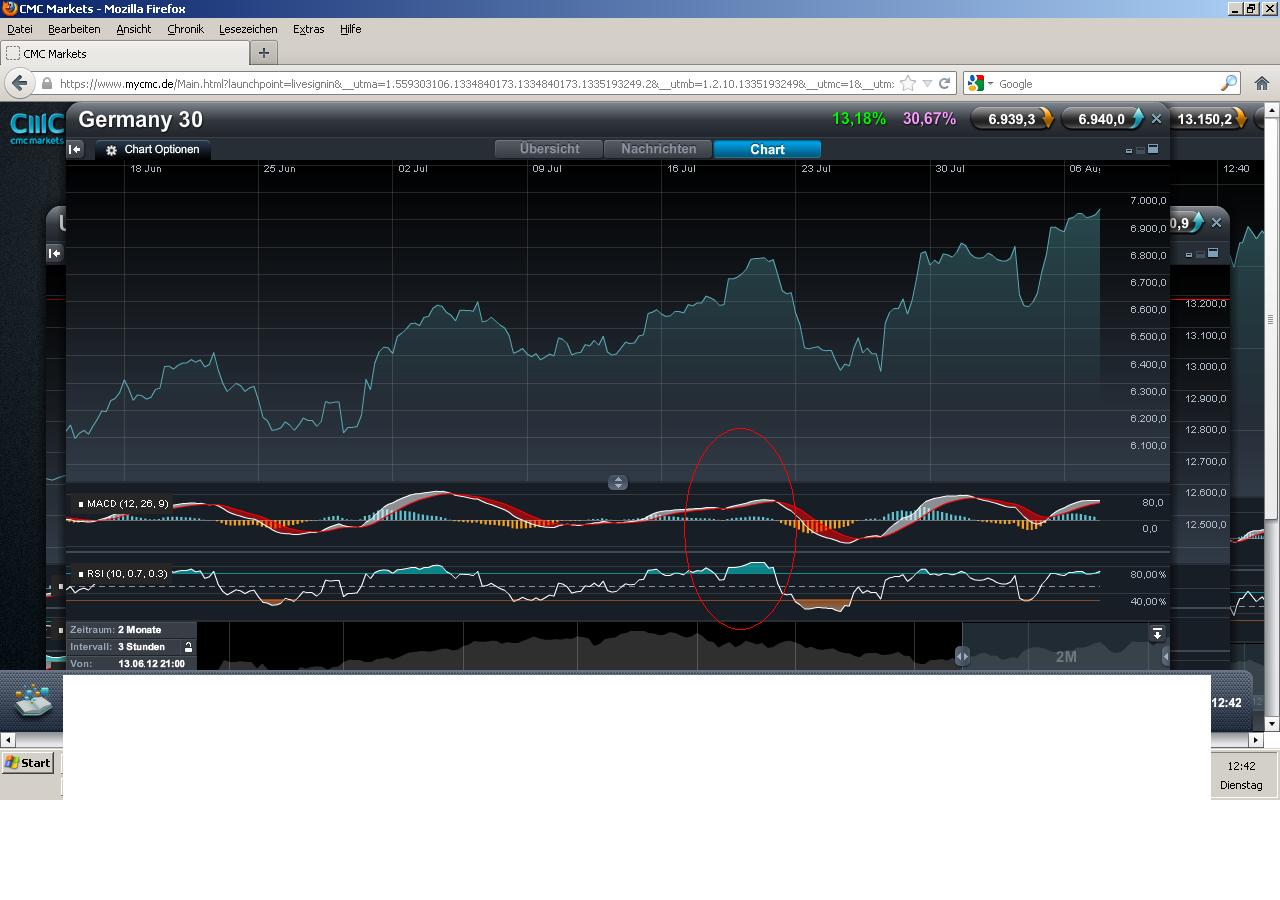 Sthenelos August 7, 2012 Antonia ich bin kein Orakel und meine Einschätzungen sind auch mal falsch, das bleibt nicht aus, man spekuliert auf Wahrscheinlichkeiten und ich hatte es schon mehrmals gesagt, dass ich Charttechnik insgesamt nicht überwerte, aber in diesem Thread geht es eben darum. Erklärung: "Die Lage bleibt bullish" weil wir uns in einem Aufwärtstrend befinden dieser kann (muss aber nicht) jetzt noch nach oben durchbrochen werden. Selbst wenn der Dax 400 Punkte in die Knie geht, sind wir noch immer in einem Aufwärtstrend. Daher bleibt die Lage vorerst bullish und das m.A. ziemlich eindeutig. Was den kurzfristigen Bereich angeht so ist der Dax mittlerweile im überkauften Bereich, wie man am Schart unten sehen kann. RSI, Stochastic (nicht im Bild) und MACD sind alle am Top. MACD und RSI hätten beim jetztigen Stand trotzdem noch etwas Luft nach oben, das sieht man immer wieder (roter Kringel, ein paar Wochen vorher). Vermutlich reicht diese Luft nicht für 300 oder 400 Punkte, vielleicht noch für 50, 100,150 - weiß ich nicht, die Wahrscheinlichkeit ist aber noch da, besonders in richtig bullishen Zeiten. Ob man darauf noch spekulieren will, ist eine andere Frage. Die Wahrscheinlichkeit, dass es aber jetzt / demnächst eine Korrektur innerhalb des Aufwärtstrends gibt ist hoch und steigt täglich. Auf ein paar Monate gesehen: so lange der Trend intakt ist, stehen die Chancen gut das Jahreshoch zu erwischen und zu übertreffen. Der Chart gibt es her. Das ist meine Einschätzung. Diesen Beitrag teilen Link zum Beitrag