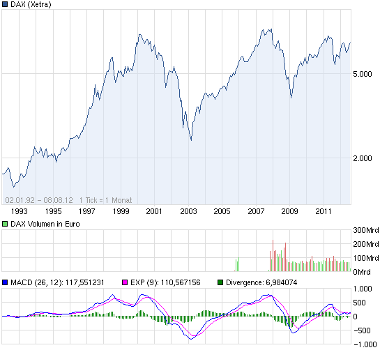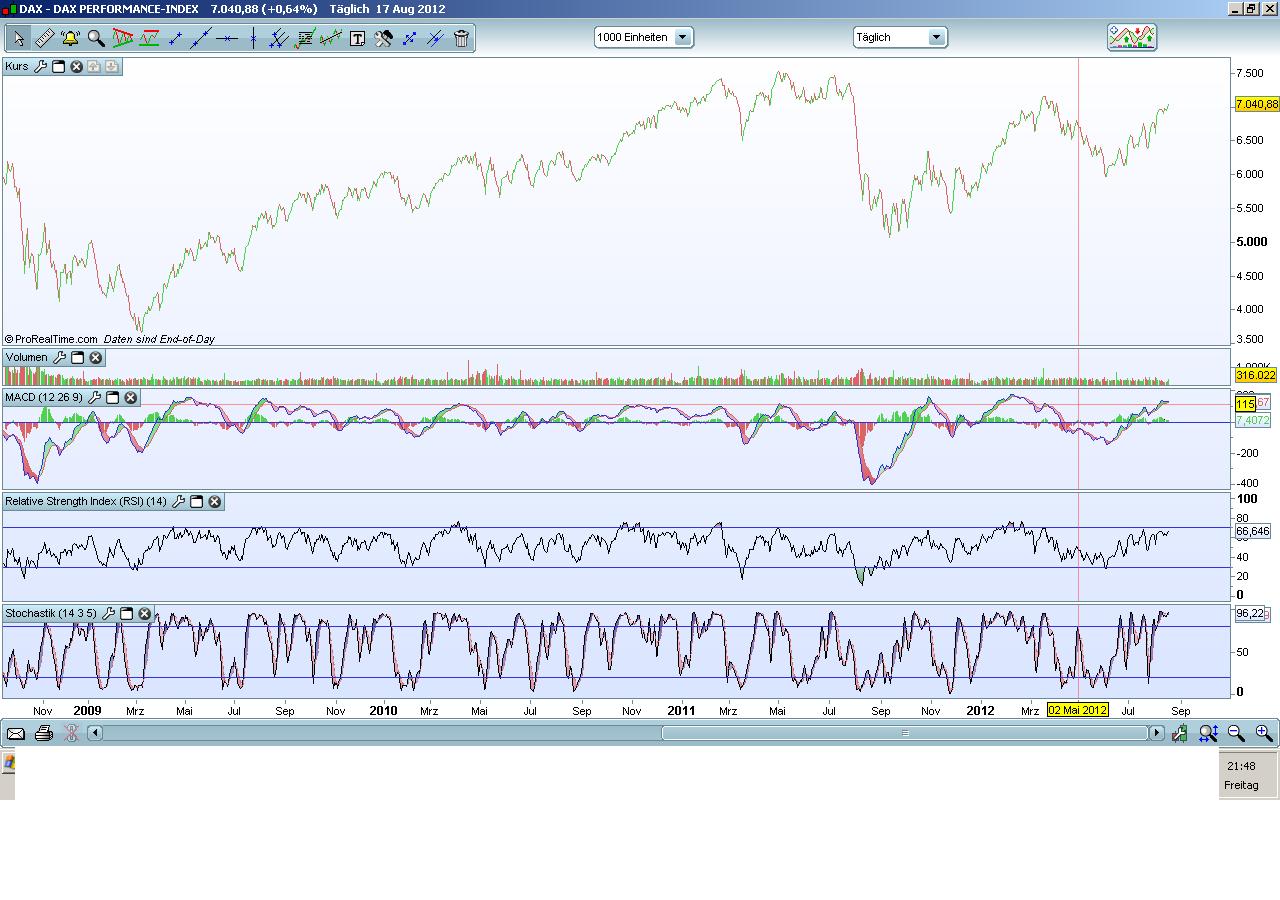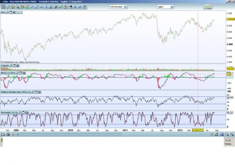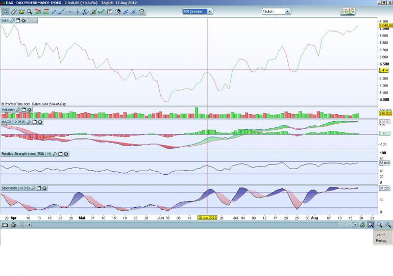 Sthenelos August 10, 2012 Jo. Von der Chartfront gibts nichts neues, außer, dass wir soeben auf dem Wochenhoch im Dow und Dax geschlossen haben. Auch die Indikatoren zeigen weiterhin kein ganz klares Bild. Ist kurzfristig die Lage überkauft (trotzdem noch mit Spielraum nach oben) ist längerfristig (siehe Jahreschart Markymark) die Lage noch längst nicht überkauft. Daher bleibe ich mal bei meiner Aussage: weiterhin klar bullish, weiterhin Korrekturen innerhalb des Aufwärtstrends möglich, mit gößerer Chance jetzt auf einen Upmove gen 7100. Lokführer oder Zugverpasser: Lokführer wäre ich gerne geworden, aber dazu braucht man Geduld und eine Portion Langeweile. Beides habe ich nicht, daher suche ich als blinder Passagier der von einem Zug in den nächsten hüpft etwas Nervenkitzel, dabei gelegentlich aber eher selten auf den falschen Zug springt / oder vom Schaffner doch erwischt wird, aber irgendwann auch ans Ziel gelangt. Diesen Beitrag teilen Link zum Beitrag