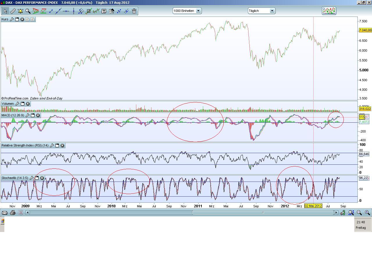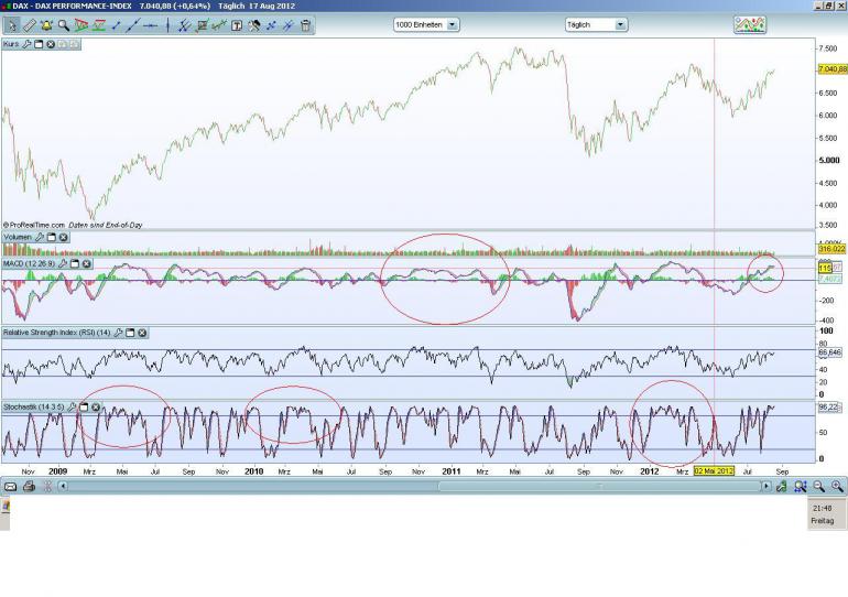 Sthenelos August 17, 2012 Jetzt sollte man nicht kaufen, sondern verkaufen! eher ja als nein Auf der anderen Seite kann man den Chart bzw. die Indikatoren natürlich auch anders auslegen und absuchen, siehe hier rote Kringel. Es gab bei MACD und Stochastic z.B. immerwieder Phasen, in welchen sie sich sehr lange Zeiträume (über Monate) im hohen Bereich befunden haben. Es gibt keine Regel, dass nach jedem Top gleich wieder ein Tief kommen muss, die Wahrscheinlichkeit ist zwar da, aber nicht absolut. Ich denke dennoch, dass die Wahrscheinlichkeit ab 7100-7200 eine Korrektur zu bekommen höher ist als ein Durchmarsch auf 7500. Die Korrektur würde ich mit bis zu 500 Daxpunkten einschätzen. Was im Anschluss geschieht, keine Einschätzung von meiner Seite aus möglich vom Chart. Diesen Beitrag teilen Link zum Beitrag