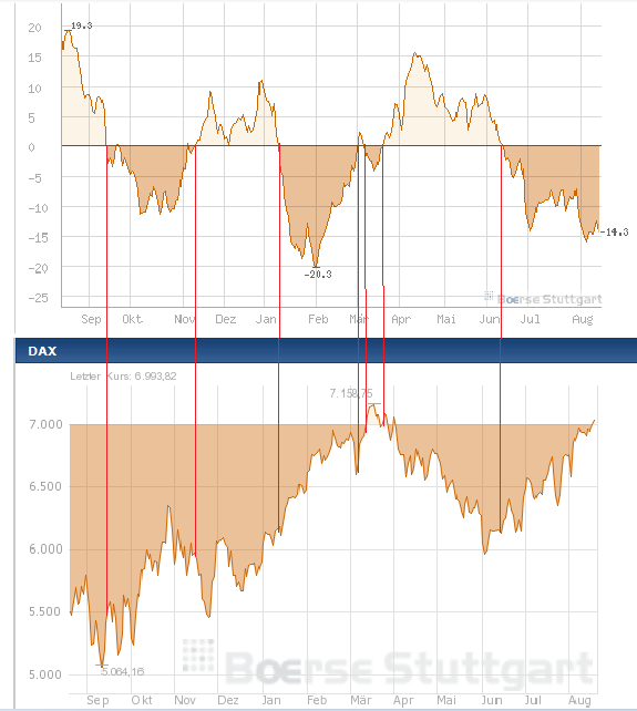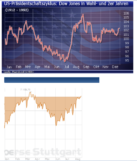 RichyRich August 18, 2012 · bearbeitet August 18, 2012 von RichyRich Also bis jetzt läuft alles nach Plan! Was haben wir? - Richtig: 1. Präsidentschaftszyklus. - 2. ein Börsenjahr dass auf "2" endet! Was bedeutet das für uns? - Dass dieser Dekadenzyklus bereits für uns untersucht wurde und fesgestellt wurde, dass sich der Dow Jones von 1912 bis 1992 in Wahl- und 2er Jahren, ungefähr so entwickelt hat: Quellenursprung: börse.ard.de (oben: Dow Jones-Untersuchung; unten: Dax 2012) Der Dax wird meiner Meinung nach bei ca 7100 einknicken. Der September behält viele ereignisgesteuerte Nachrichten für uns vor, da die einzelnen Termine schon feststehen. (u.a. die Entscheidung über Grichenlands, Verfassungsgericht zum ESM u. Fiskalpakt, Draghi alias Super Mario wird sprechen) Historisch gesehen und weit ins futuristische blickend, würde es mich nicht wundern, wenn Israel gerade im September im Alleingang den Iran angreifen würde. (siehe aktuelle Berichte) - Und wenn sie sich nur damit brüsten wollen, dass das Atom-Programm weit zurückgeworfen wurde und USA dann nach der Wahl den Rest erledigen dürfen. Es lohnt auch immer ein Blick auf die Stimmung der Trader... Quellenursprung: Börse Stuttgart (oben: EUWAX-Sentiment; unten DAX 2012) Fazit: Wir sind gut im Plan und schlecht in der ... Diesen Beitrag teilen Link zum Beitrag