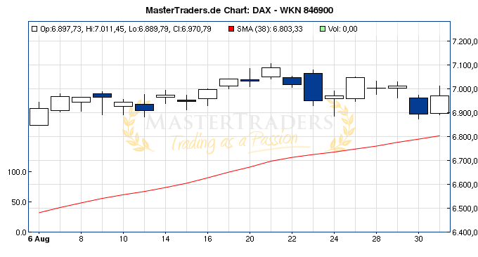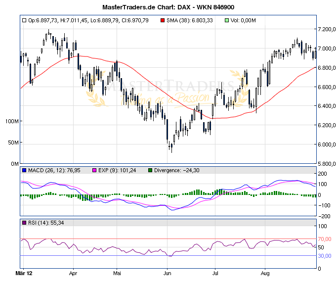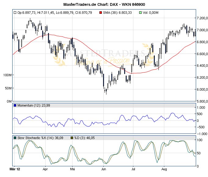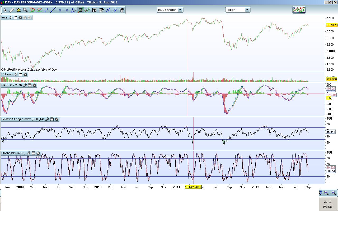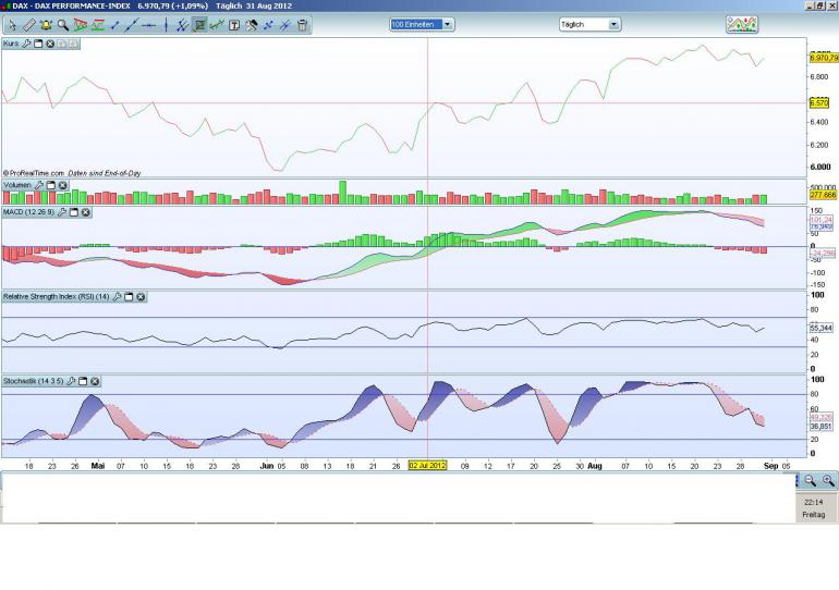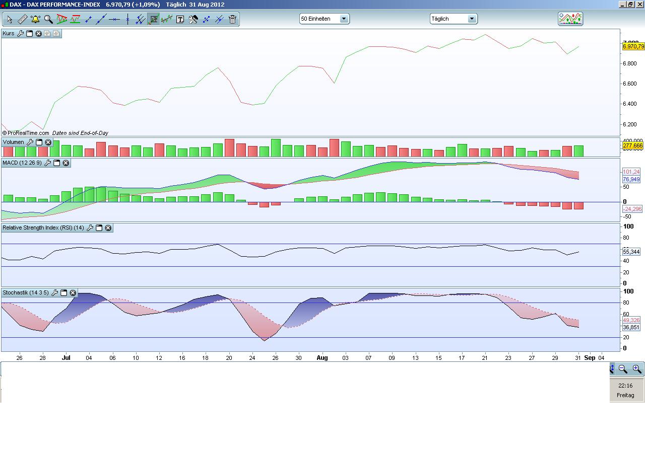 markymark September 2, 2012 · bearbeitet September 2, 2012 von markymark Ich habe noch vorsichtshalber meine Indikatoren überprüft. Lediglich beide RSI Indikatoren bestätigen tatsächlich die Bullenflagge und vorher keine Hinweise auf Trendumkehrung (Stichwort: negative Divergenz). MACD jedoch bildete diese negative Divergenz. Auch ADX in Verbindung mit AROON zeigen diese Divergenz. Ich persönlich würde erst Bruch von 7100 abwarten, denn in diesem Falle haben wir Kursziele 7200 bis 7400. Richtig, die 7100 würde ein klares Kaufsignal ergeben. Sehe ich wie du. Ebenso den Rest, den du angesprochen hast. Allerdings auch ein kleines Kaufsignal, sollte der Dax über 7000 morgen schließen: Nehmen wir noch das Momentum und die Slow Stochastik hinzu. Momentum in der Korrekturbewegung. Schwaches Momentum ist nicht gut für steigende Kurse, jedoch gabs die letzten Monate an der Nulllinie immer wieder eine Trendumkehr. Die Slow Stochstik sollte bald wieder nach oben drehen. Mein Fazit. Bis auf den MACD und eingeschränkt das Momentum sieht das gesamte Chartbild gar nicht so schlecht aus. Wenns daneben geht, kann hier gerne meine Chartanalyse fürn A**** erklärt werden Ich bin echt auf Morgen gespannt, wenn die Amis nicht mitspielen. Dann haben wir nur Asien als Vorgeber.... Diesen Beitrag teilen Link zum Beitrag