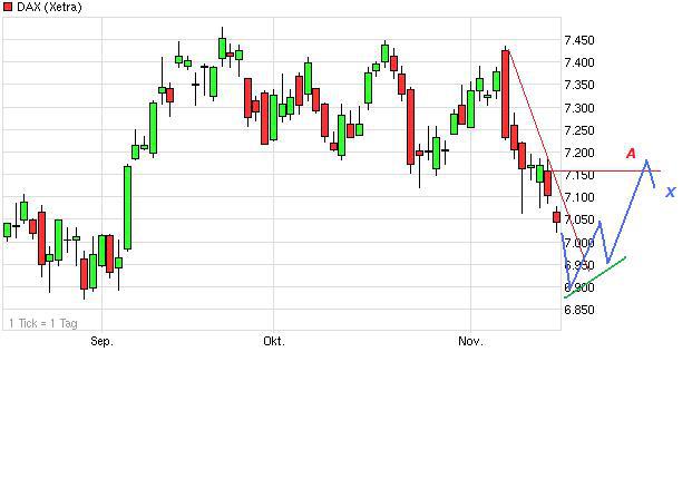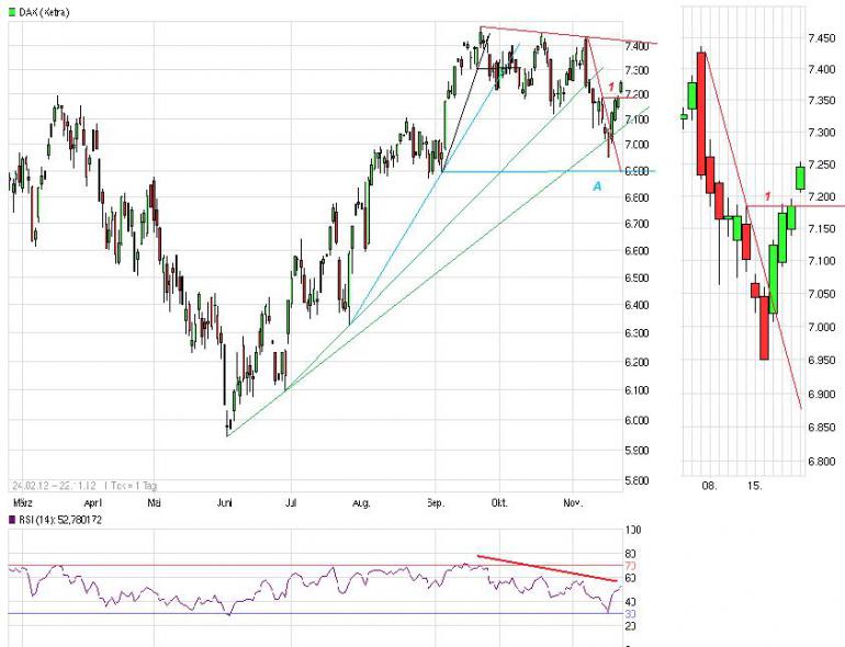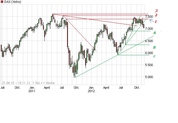Aktiencrash November 22, 2012 Kurzfristig liegt im Bereich 6900 Punkte die nächste größere überverkaufte Zone (A). Mit erreichen und unterschreiten dieser Zone, sollte es zu einer Gegenbewegung nach Norden kommen, die bis in den Bereich (A) von knapp 7150 Punkte reichen könnte. Bildet sich im Umkehrbereich von 6900 vorab ein Aufwärtstrend (Linie grün), stehen die Chancen gut, das der Dax noch einmal in den Bereich 7500 Punkte vordringen kann. Bisher wurde die nächst größere überverkaufte Zone A noch nicht erreicht. Der kurzfristige Abwärtstrend wurde nach erreichen von 6950 Punkte nach oben durchbrochen. Der Dax konnte sich bereits an den hier aktuell horiz. Widerstand 1 von ca. 7180 Punkte hocharbeiten und diesen im heutigen Tagesverlauf überwinden. Damit ist der Dax kurzfristig überkauft und dürfte in eine weitere Konsolidierungsphase übergehen. Der RSI bestätigt weiterhin mit seiner neg. Konvergenz (rot) das die Talfahrt für den Dax noch nicht beendet ist. Aus charttechnischer Sicht hat sich bisher auch keine Umkehrformation ausgebildet. Es muss somit weiterhin gerechnet werden, das der Dax auf den nächst größeren überverkauften Bereich von 6900 Punkte zusteuert und diese auch kurzfristig unterschreitet. Diesen Beitrag teilen Link zum Beitrag