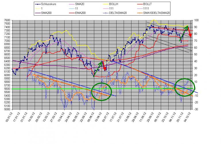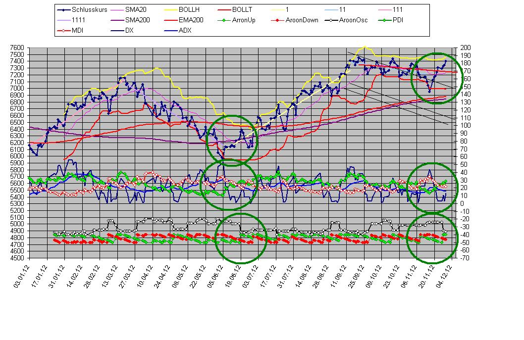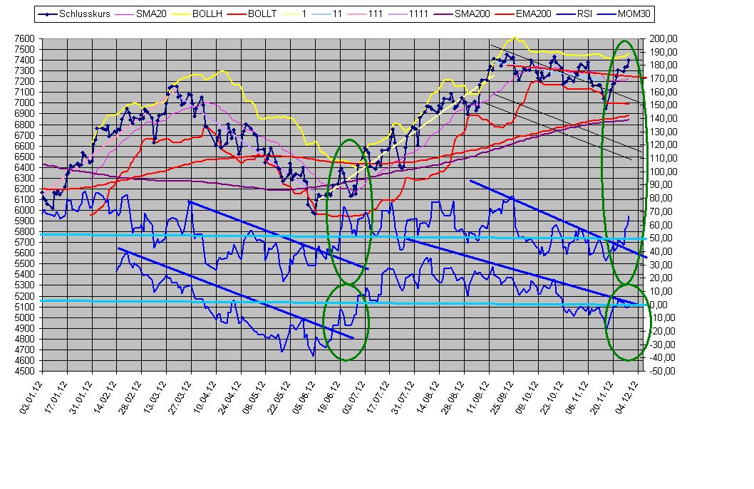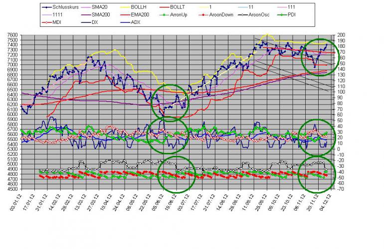 Sthenelos November 30, 2012 Meine zweite Einschätzung bzgl. "m Anschluss halte ich es für wahrscheinlich, dass der Dax wieder Richtung 6900 und tiefer fällt." müsste ich anhand von den Indikatoren eindeutig revidieren. Diese liefern im Moment ein so bullishes Signal, dass sogar neue Jahreshochs im Dax möglich sein können und vermutlich werden. Ich werde daher im Moment keine Shorts laden und abwarten, das Charbild bzw. Indikatorenanalyse würde ich als ganz klar bullish interpretieren, mein Gefühl warnt mich aber bzgl. der anstehenden Lage (Fiscal Cliff) - wobei davon auszugehen wäre, dass die Märkte eine positive Einigung der FC jetzt schon einpreisen werden. Jahreshoch heute erreicht und überschritten. Der Dax hat eine ganz enorme Stärke in diesen Tagen und rennt unaufhaltsam voran, der Dow Jones ist im Vergleich dazu ein halbstarker Milchbubi. Ausblick: Indikatoren sind kurzfristig weitgehend im überkauften Bereich, bekanntlich können sie sich dort in so bullishen Phasen aber viele Tage und sogar Wochen halten. Korrekturen daher eher auf hohem Niveau zu erwarten, harte Abverkäufe im Moment noch unwahrscheinlich. Kurse innerhalb der nächsten 4 Wo. über 7600 Punkte im Dax würden mich nicht wundern, die Marken vor der Eurokrise (ca. 7500) müssten nun überwunden werden. Gegenüber steht noch immer die ungelöste Fiscal Cliff und die Zeit wird verdammt knapp, vielleicht war die ganze Jahresendrallye auch ein Tagtraum der sehr schnell vorbei sein wird. Die Jahresendrallye beginnt jetzt nicht erst, wird sind mitten drin und m.E. haben wir gute 2/3 schon hinter uns. Diesen Beitrag teilen Link zum Beitrag