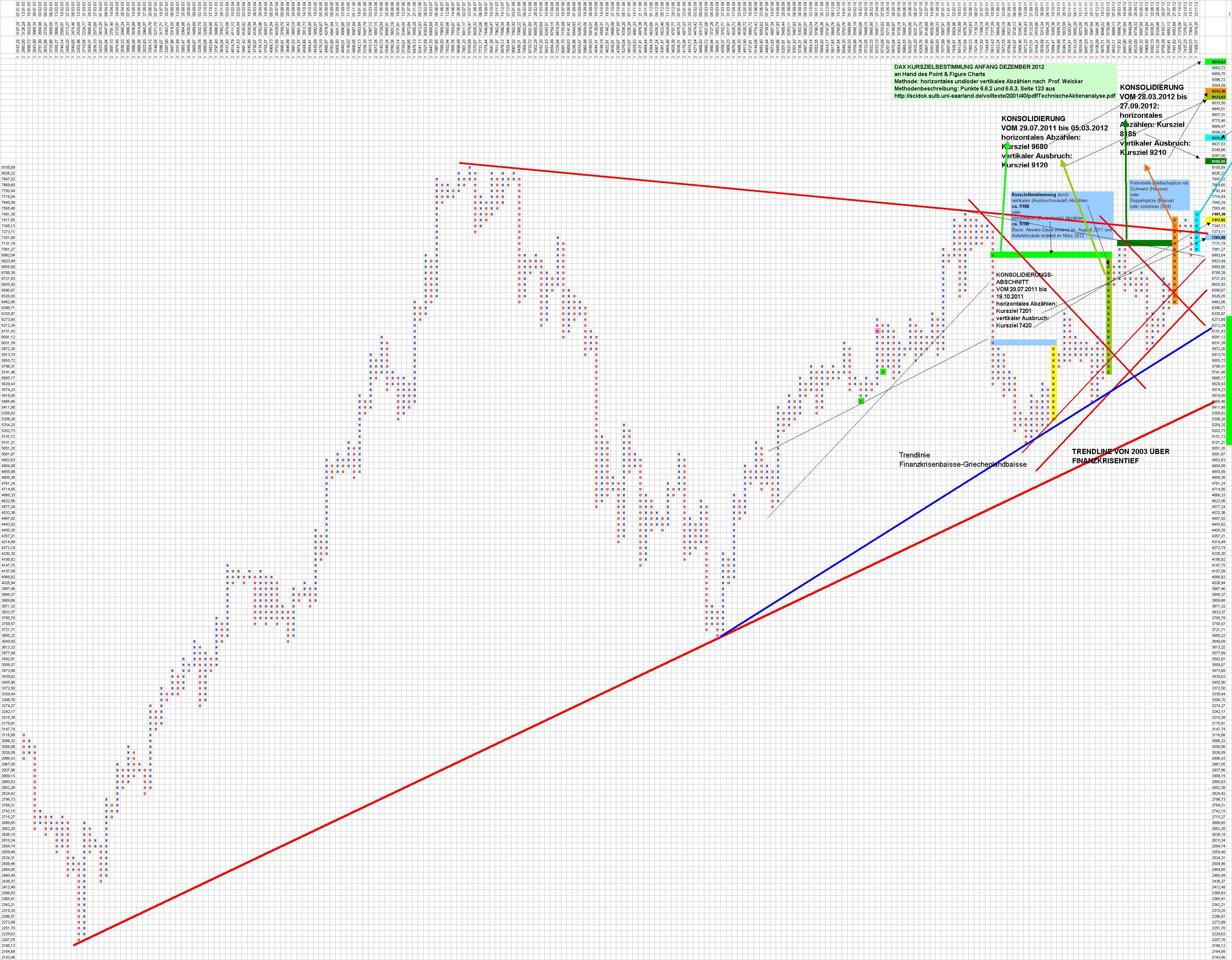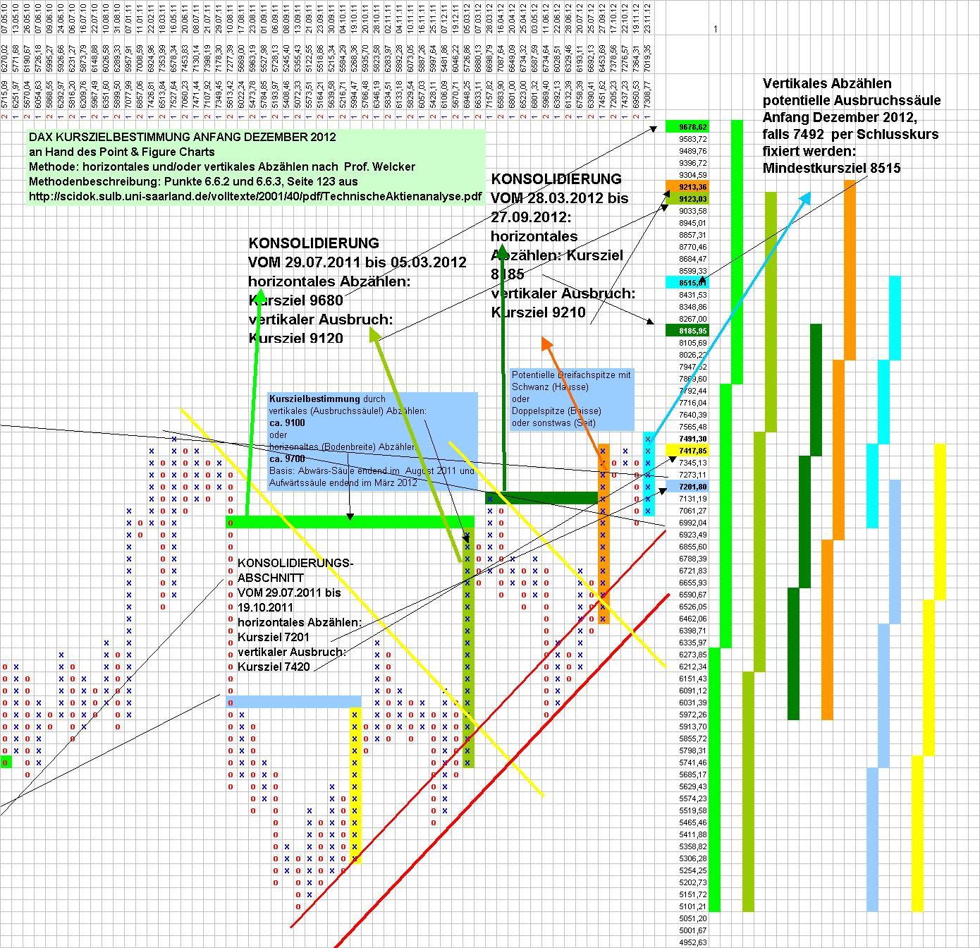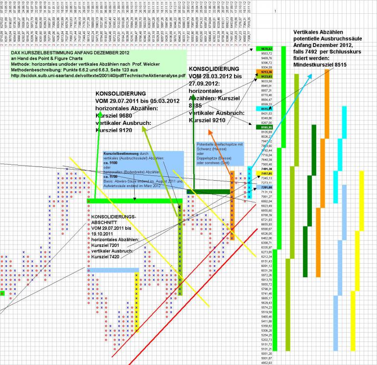 diagenes Dezember 3, 2012 · bearbeitet Dezember 4, 2012 von diagenes Point & Figure Charts sind uralt, sie wurden beispielsweise von Paul Lerbinger >>, der es inzwischen weit gebracht hat, in seinem Buch "Börsenstrategie P&F-Charts" bereits 1984 beschrieben. Ihr ursprünglicher Zweck war, möglichst nur statistisch relevante Kursbewegungen händisch zu erfassen in jener Zeit, in der es noch keine Computer für die breite Masse der Menschen gab. Eine sehr schöne Beschreibung finden wir auch in Prof. Welckers kostenlosem PDF-Buch Technische Aktienanalyse von Professor Welcker >> Ferner sei verwiesen auf eine kurze und kompakte Beschreibung hier >> Auch Cougartrader hat hier im Forum >> bereits die Vorzüge von P & F -Charts beschrieben. Ein besonderer Nutzen von Point & Figure Charts besteht darin, daß aus ihnen Kursziele mit sehr einfachen Methoden abgeleitet werden können. Wenn der Bulle den Bären in zahlreichen Kämpfen niedergerungen hat, wird er wahrscheinlich weiter nach oben traben, als wenn er ihm nur kurz ein paar Kratzer zufügen konnte. Und wenn er in einem gewaltigen Satz den Weg nach oben beginnt, wird er weiter kommen als wenn er nach kurzem Aufstieg schon wieder vom Bären attackiert wird. Diese Betrachtung kann die Methoden des horizontalen und vertikalen Abzählens in Point & Figure Charts etwas verbildlichen. Ein Bildchen dazu ist dieses: Kurszielbestimmung und Analyse von P & F -Formationen ist auch hilfreich beim Nutzen anticyclischer Tradingpunkte. Wenn ein Kursziel noch längst nicht erreicht ist, wird man nicht unbedingt anticyclische Verkäufe tätigen und man kann anticyclische Käufe mit weniger Angst eingehen, wenn das ermittelte Ziel noch weit entfernt ist. An Hand seines P& F-Charts können nun aus dem Geschehen der Jahre 2011 bis 2012 Kursziele für den DAX abgeleitet werden. Die Ziele sind nun wie folgt: Prognose 1 aus dem P & F-Muster vom 29.07.2011 bis 05.03.2012 leiten sich ab durch horizontales Abzählen der Musterbreite das Kursziel 9680 vertikales Abzählen des Ausbruchs das Kursziel 9120 Prognose vom Beginn der Griechenbaissen-Konsolidierung Bereits aus dem P & F-Muster vom 29.07.2011 bis 19.10.2011 ließen sich ableiten durch horizontales Abzählen der Musterbreite das Kursziel 7201 vertikales Abzählen des Ausbruchs das Kursziel 7420 Aus diesem Muster hätte man also bereits am 19. Oktober 2011 ziemlich genau den Bereich, in dem der DAX zur Zeit seine Bahnen zieht, prophezeien können. Historia magistra est. Prognose 2: Aus dem P & F-Muster vom 28.03.2012 bis 27.09.2012 lassen sich ableiten durch horizontales Abzählen der Musterbreite das Kursziel 8185 vertikalers Abzählen des Ausbruchs das Kursziel 9210 Hochspekulative Prognose 3: Weil die P & F - Formation einer Dreifachspitze mit Schwanz noch nicht vollendet ist und möglicherweise sich noch in eine Vierfachspitze umwandeln kann, ist die folgende Prognose noch sehr spekulativ. Aus dem P & F-Muster des ätzenden Seitwärtstheaters seit dem 12. September 2012, welches sich im P & F- Chart zu einer bis jetzt sich erst abzeichnenden Dreifachspitze mit Schwanz verdichtet, läßt sich ableiten dann und nur dann wenn 7492 per Schlusskurs fixiert werden, ein Mindestkursziel von 8515. Für jeweils 75 Punkte, um die der DAX über die Marke von 8515 weiterzieht, ohne einen dreiprozentigen Rücksetzer zu machen, erhöht sich das Kursziel um 225 Punkte. Tagestheater Zur Zeit erwarten professionele Chart-Analysten wie zum Beispiel Rocco Gräfe einen Rücksetzer via 61 % Retracement auf bis zu 7120 Punkte, damit der DAX seine derzeitige Überkauftheit abbaut. Mir persönlich wäre das ganz recht, denn ich stehe Gewehr bei Fuß. Solange mir die 7492 per Schlusskurs nicht dazwischenfunken, spekuliere ich auch auf Rocco Gräfes Retracement. Wenn dieser Rücksetzer stattfände, würde aus der Dreifachspitze mit Schwanz gegebenenfalls eine Vierfachspitze. Dann müßte der DAX schon in einem Zug ohne dreiprozentigen Rücksetzer auf 7620 steigen, damit das Mindestkursziel von 8515 wieder auftauchen könnte. Zur Zeit (2012-12-03, 17:20 Uhr) schmiert der DAX, nachdem er 2 Stunden mit den Hörnern die 7480er Marke bekloppt hat, gerade ab und ist bei 7424. Die im P & F Chart so interessante 7492er Marke wird also heute wohl nicht fallen und Rocco Gräfes Szenario gewinnt wieder Oberwasser. Zusammenfassung Unabhängig von solchem Stundentreiben leiten sich die aus den Point & Figure-Charts gewonnenen Kursziele von 8200, 9200 und 9600 aus dem Bild von monatelangen Kämpfen zwischen Bullen und Bären ab und lediglich die spekulative Prognose3 hängt auch vom heutigen Geschehen ab. Bei Welcker finden wir die Aussage: "Cohen hält den Vertical Count für verläßlicher als den Horizontal Count." Das hieße nach Cohen: Kursziel im DAX aus heutiger Sicht 9200. Fundamentales Stimmungsbild Auch fundamentale Faktoren rechtfertigen meines Erachtens eine Neubewertung der deutschen Aktien. Die deutschen Unternehmen können sich die Sahne arbeitsloser akademischer Talente aus Südeuropa unter den Nagel reissen, das nach Deutschland flüchtende südeuropäische Kapital erzeugt traumhaft niedere Zinsen, zu denen sich die deutschen Unternehmen Kapital für Investitionen besorgen können. Im DAX sind Schwergewichte wie SAP, Bayer, Linde, VW bereits auf dem Weg zu historischen Höchstkursen. Die von der Energiewende gebeutelten EON und RWE haben lockeres Verdoppelungspotential, dasselbe gilt für die mit dem Makel der Finanzkriste eher zu Unrecht verleumdete deutsche Bank und die Telekom. Die Produkte deutscher Unternehmen werden in den BRIC-Staaten nachgefragt und diese Nachfrage wird auf Sicht von 10 Jahren mit hoher Wahrscheinlichkeit wachsen. In allen Zeitungen pfeifen es die Anlageberater von den Dächern: wer nicht in Aktien investiert, riskiert durch den negativen Realzins Vermögensverluste. Auch werden Versicherer und große Fondsgesellschaften überlegen müssen, ob sie an der Anlage in "SICHERE STAATSANLEIEHEN" festhalten 