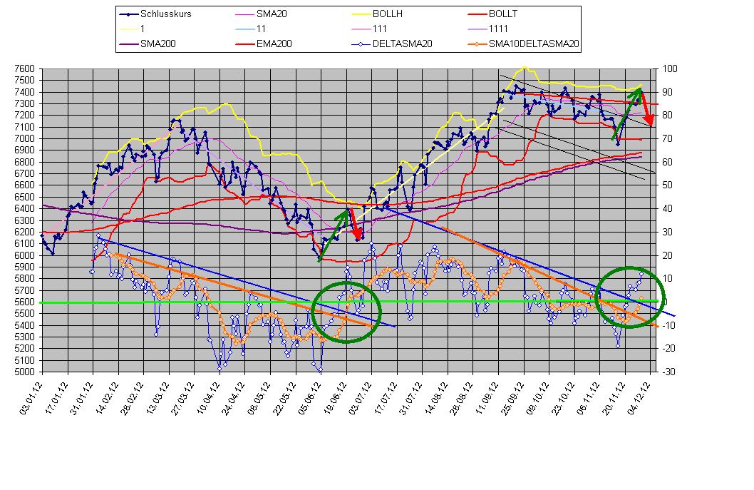helios Dezember 8, 2012 · bearbeitet Dezember 8, 2012 von helios Salve miteinander, als Obstbauer konstatiere ich - der Apfel hat einen Stich!!! - zumindest ist ein nicht nur in Finnland bekannter Wurm in it - solche Probleme gibts immer, wenn ein Marktteilnehmer so fett geworden ist, dass er beim Pinkeln nicht mehr über seinen vollgefressenen Wanst schauen kann. Die s&p500 Schlusskurse sind die Woche leicht gestiegen, der 50Tagekurs ist am Fallen. Zum Wochenschluss wurde der 50 Tageskurs überschritten - intraday wird bei 1420 radikal abverkauft, dass muss ein Twister sein. Über den dt. Markt wird sehr viel Euphorie verbreitet, das stimmt micht nachdenklich. Richtig ist, dass es einen netten break-out über die 7451,62 Schlusskurs vom 21.9.2012 gab, sowas läuft normalerweise still und leise ab - in jeder TV-Sendung trällert es was vom Jahreshoch und ach wie ist das toll. Eigentlich müsste man sein Depot komplett räumen - ich geh davon aus, dass die Euphorie gespielt ist, weil die Journalisten sehen, was mit den Kollegen bei der FTD passiert ist und jetzt hängt sich jeder rein und macht auf happy lila laune Bulle. Also weitermachen und wegducken. Diesen Beitrag teilen Link zum Beitrag