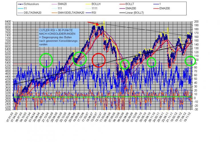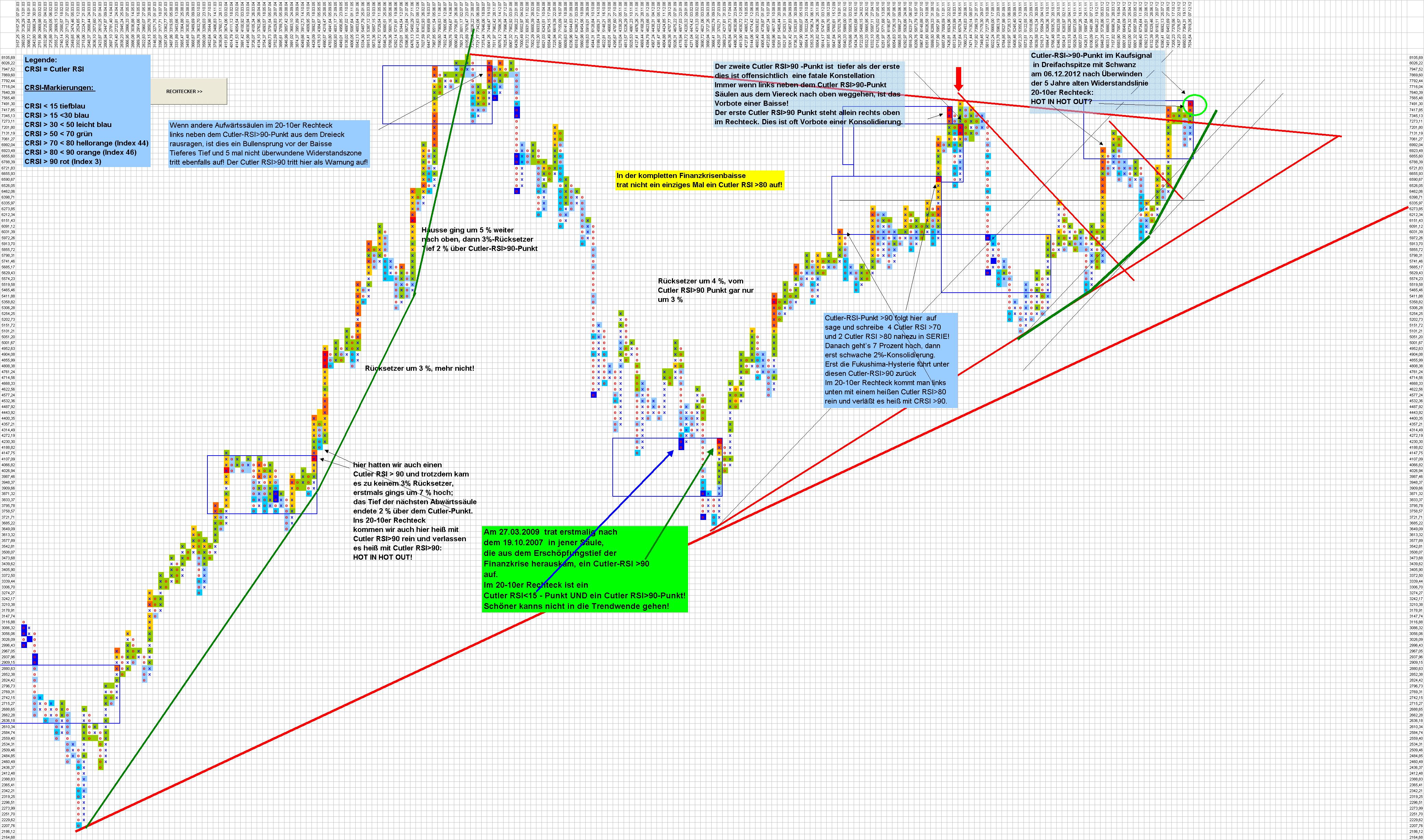 diagenes Dezember 10, 2012 · bearbeitet Dezember 11, 2012 von diagenes Zur Zeit hätten ich und viele andere gerne eine Korrektur, um gut einzusteigen. Rocco Gräfe schnattert schon die ganze Zeit vom Pull Back. * Doch der kommt und kommt und kommt einfach nicht. Der Markt ist ja so überhitzt! Mir kommen langsam die Tränen von all der Hitze! Wenn ich wegen des ganzen Pull-Back-Geschwätzes den rechtzeitigen Einstieg verpassen sollte, dann sehe ich so rot wie ich den Cutler-RSI >90 farblich darstelle. Den großen Spielern ist es, wenn sie auf einen Hausseschub setzen, vermutlich egal, ob der Markt überhitzt ist oder nicht. Die kaufen und kaufen und kaufen und schon sind die Papiere in festen Händen. Nun aber Spaß beiseite! Im folgenden analysiere ich die derzeitige Situation an Hand eines Point & Figure-Charts unter Integration von Cutler-RSI's. Ich habe eine Methode entwickelt, Cutler RSI's, ich nenne sie mal CRSI's farblilch hervorzuheben. Damit verlasse ich die klassische Point & Figure-Analyse, indem ich den Cutler-RSI-Wärmegrad in die Darstellung einführe. CRSI < 15 tiefblau CRSI > 15 <30 blau CRSI > 30 < 50 leicht blau CRSI > 50 < 70 grün CRSI > 70 < 80 hellorange (Index 44) CRSI > 80 < 90 orange (Index 46) CRSI > 90 rot (Index 3) Man sieht, daß ein Cutler RSI >90 seit 2003 nur insgesamt 10 mal (wenn man zeitlich nahes Vorkommen zusammenfaßt) auftritt. Nach dem 19.10.2007 trat der Cutler RSI>90 erstmals wieder am 27.03.2009 in Erscheinung in jener Point & Figure-Aufwärtssäule, die sich am Ende der Finanzkrisenbaisse aus dem Loch des letzten Ausverkaufes erhob. Er war also wie ein Lorbeerkranz, den sich der wieder erstandene Bulle aufsetzte bei seinem Aufbruch in die Hausse nach der Finanzkrise. Cutler-RSI>90 ist also ein sehr seltenes Ereignis, das von gewaltigem Kaufdruck kündet, und verdient daher unsere Beachtung. Wenn man den Cutler RSI>90 rechts oben in einem Rechteck das 20 Kästchen Breite (= jeweils 10 potentielle Auf- und Absäulen) sowie 10 Kästchen Höhe (= 10 Prozent Kursspanne) hat, plaziert, so gibt es 4 Muster: Cutler-RSI-Rechteck, Muster 1: Rechteck links so gut wie leer: vor Konsolidierungen in Haussen. Cutler-RSI-Rechteck, Muster 2: Rechteck links besetzt, Säulen kommen von unten und sind alle niedriger als der Cutler-RSI>90 Punkt: vor oder nach Ausbruch aus Konsolidierung, starkes Hausse-Bild Oft gilt: die ersten Säulen, die in so ein Rechteck eintreten, enden auch heiß: HOT IN HOT OUT. Cutler-RSI-Rechteck, Muster 3: Rechteck links besetzt, Säulen kommen von unten und mindestens eine ist höher als der Cutler-RSI>90 PUnkt, stößt also das Rechteck nach oben durch: dieses Bild tritt zeitig vor mächtigen Baissen auf (Finanzkrisenbaisse, Griechenlandbaisse) Cutler-RSI-Rechteck, Muster 4: Rechteck links besetzt, Säulen kommen von links von oben: Trendwende nach Baisse. Der Cutler-RSI-Punkt kann auch >70 oder >80 statt >90 in diesem Bild sein. Hier ist oft ein Cutler-RSI<15 links oben oder leicht links über dem Rechteck. COOL IN HOT OUT. Am 06.12.2012 trat nun das Cutler-RSI-Rechteck Muster 2 auf und kündigt meines Erachtens eine starke Hausse an. Der Cutler-RSI>90 Punkt ist gleichzeitig das Kaufsignal in einer Dreifachspitze mit Schwanz. Natürlich ist der Markt nun extrem überhitzt. Aber: das war er bei Cutler-RSI>90 Punkten in der Vergangenheit auch. Und was geschah dann? Meist so gut wie nix, maxmimal waren die Korrekturen lumpige 3 % nach unten vom Cutler-RSI>90 Punkt aus betrachtet. Kommentar vom 11.12.2012: das sollte ich schon noch genauer an Hand klassischer Charts analysieren. Und zwar insbesondere für die Zeit vom 29.10.2004 bis 5.5.2005 und für die Zeit vom 31.08.2010 bis 11.01.2011. Wozu geschah denn das ganze Konsolidierungstheater vom 12. September 2012 bis zum 16. November 2012? Wozu das Bullish Kicking und das mächtige Kaufsignal jetzt? Damit das nächste ätzende Seitwärtstheater schon wieder losgehen kann? Das glaube ich nicht, meines Erachtens hat der Bär nun genug Prügel bezogen und verzieht sich in den wohlverdienten Winterschlaf. Im Übrigen wäre die derzeitige Hausse aus Sicht der Point & Figure-Analyse noch immer intakt, selbst wenn der DAX auf 6590 abschmieren würde. Fazit: Aus Sicht der Point & Figure-Analyse ist Kaufzeit und die Frage ist nur noch: Wann ist ein guter Zeitpunkt zum Einstieg da? Das seltene Ereignis des Cutler RSI>90 spricht meines Erachtens dagegen, auf ausgeprägte Retracements zu setzen. Die hier gezeigte Darstellung kann dazu dienen, anticyclisch günstige (RSI-kalte) Bereiche in einer Hausse zu erkennen. @ Antonia: Danke für den Hinweis auf die Angst, ich ergänze daher die Zusammenstellung um den VDAX. Der VDAX ist im Sinken und sehr niedrig. Leider finde ich zum VDAX bei Ariva-VDAX-Kurshistorie >> nur Kursdaten ab 2005. Ich sehe nun eine gewisse Ähnlichkeit zur Situation in 2006. Auch damals mündete eine Konsoldierung in einen Hausseschub. Nach VDAX ist sehr wenig Angst im Markt. Gerade die großen Akteure würden meines Erachtens absichern, wenn sie dem Braten nicht trauen würden. Käme Angst im Zuge einer stärkeren Konsolidierung auf, so würde der VDAX rasch über die 20 steigen. *Kommentar vom 11.12.2012: Heute, am 11.12.2012 erzählt der gute Rocco schon wieder vom Aufwärtstrend vom Juni als geradezu gigantischem Widerstand, markiert die Trendlinie mit vielen roten Pfeilen und spricht von einer absoluten Nebenvariante, daß der DAX über die 7550 ausbricht. Ich zitiere: "Bricht der DAX nun schon heue über 7550 aus, was ja nun absolut die Nebenvariante ist schon allein wegen des Juni-Trends und dieser zahlreichen Auflagepunkte und der allgemeinen Überkauftsituation, aber wenn er es trotzdem schafft, dann wäre Sieben Sechs (7600) ein wichtiges mittelfristiges Ziel, welches sich aus der Gesamtlage seit 2007, also seit 5 Jahren ergibt, noch erreichbar. " Es ist nun 11.00 Uhr und der DAX attackiert gerade die 7570. Der verdammte Junitrend baiert auf einer Trendlinie, die im Juni