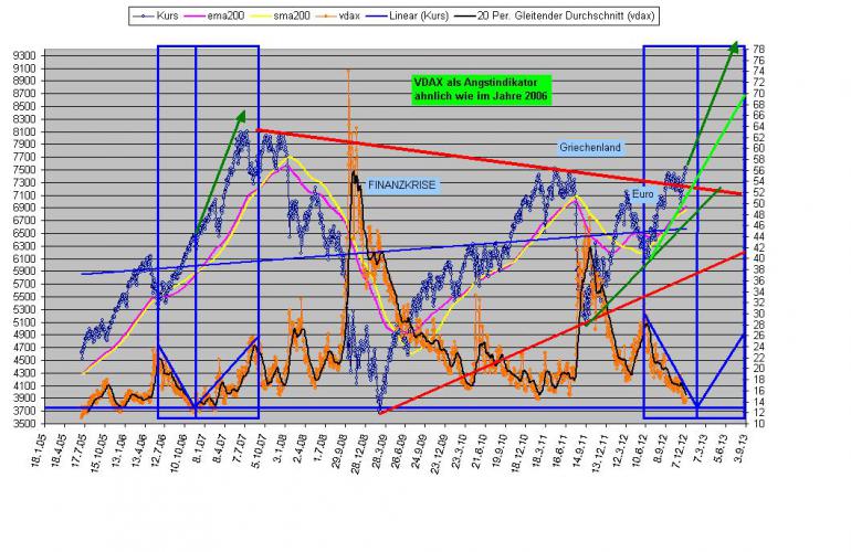 Antonia Dezember 14, 2012 · bearbeitet Dezember 14, 2012 von Antonia Zur Zeit hätten ich und viele andere gerne eine Korrektur, um gut einzusteigen. ... Wozu geschah denn das ganze Konsolidierungstheater vom 12. September 2012 bis zum 16. November 2012? Wozu das Bullish Kicking und das mächtige Kaufsignal jetzt? Damit das nächste ätzende Seitwärtstheater schon wieder losgehen kann? ... Die hier gezeigte Darstellung kann dazu dienen, anticyclisch günstige (RSI-kalte) Bereiche in einer Hausse zu erkennen. ... @ Antonia: Danke für den Hinweis auf die Angst, ich ergänze daher die Zusammenstellung um den VDAX. Der VDAX ist im Sinken und sehr niedrig. ... Es ist nun 11.00 Uhr und der DAX attackiert gerade die 7570. Der verdammte Junitrend baiert auf einer Trendlinie, die im Juni zwischen dem Tief und dem ersten Folgetief angelegt wurde. Ist so was eine statistisch relevante Trendlinie? Ich bevorzuge eine echte Ausgleichsgerade und deren Parallelen, die die Tiefs und Hochs eingrenzen und die die gesamte Hausse und nicht bloß ihren von politischem Gehampel verfälschten Start berücksichtigen. Von Rocco Gräfe kann man viel lernen, aber man sollte seiner Meinung nicht mehr als der eigenen folgen. ... Zuerst einmal kann man enorm viel studieren und dann doch nichts auf die Reihe bringen. Man muss einfach einsteigen und seine Erfahrungen sammeln. Und leider meistens erst einmal negative, weil man zu zittrig ist. Da hilft auch kein VDAX. Geh einmal etwas weg von den ganzen Charts, sie können Orientierung bringen, aber sie wissen nichts über die Zukunft. Das kannst du dir doch auch selbst denken. (Und ein Rocco Gräfe kann auch nur Linien ziehen und anhand derer Vermutungen anstellen. Er selbst hat mal gesagt, die Chance sei (höchstens) 60% zu 40%, dass es so komme. Das ist etwas besser als 50:50, also raten!) Schaust du dir einen längerfristigen Chart an, dann siehst du, dass wir uns ziemlich weit "oben" bewegen. Grundsätzlich nicht gerade der beste Einstiegspunkt. Schau dir den S&P500 und DowJones an, das sind nun einmal die führenden Indizes - beide haben ein schönes Top gebildet. Wenn es nachhaltig darüber geht, dann sieht es schon mal besser aus. Wenn nicht, dann ist das gar nicht gut. Nachtrag: "Der VDAX ist im Sinken und sehr niedrig." heißt, dass man vorsichtig werden sollte. Schau dir hier den längerfristigen Chart an im Vergleich zum Dax: VDAX-New Diesen Beitrag teilen Link zum Beitrag