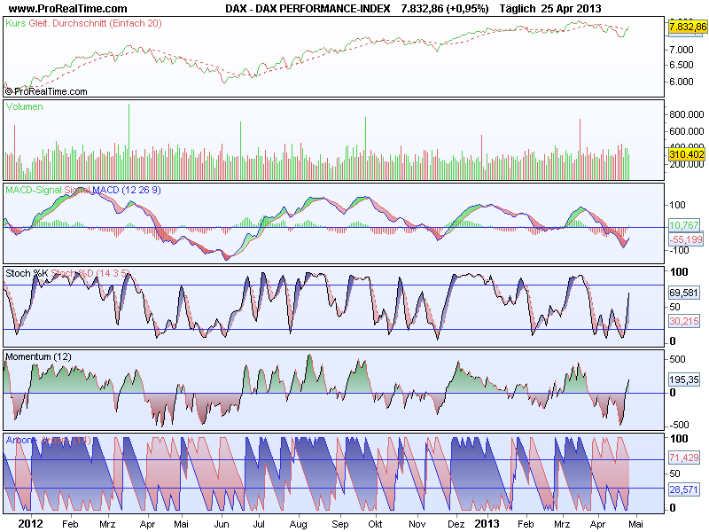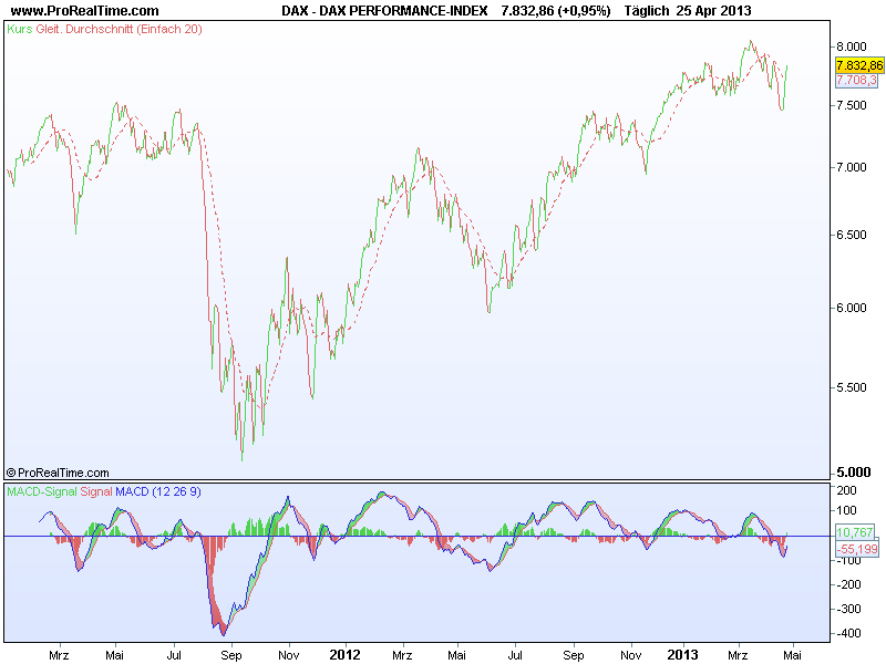 Sthenelos April 25, 2013 aus dem "wann bricht der Dax wieder ein" Thread hierher kopiert, passt besser: Die Marken 7500-7400 sind nun in Reichweite, die nächsten Tagen bringen die Entscheidung - ich fürchte weiterhin, dass sie erreicht werden. Geschieht es so, dann ist die Wahrscheinlichkeit für ca. 6900-7000 im Mai/Juni sehr groß. Verschnaufspause an den Börsen über den Sommer... Der Ami muss auch bald korrigieren und der kann den Dax noch "sehr weit" mit nach unten reißen, der hat noch einen sehr langen Weg nach unten, innerhalb vom Aufwärtstrend. Ich muss daher leider weiterhin bearish bleiben für die nächste Zeit - kleinere Upmoves über ein paar hundert Punkte sind möglich. Panik ist noch keine zu erkennen und die Korrektur verläuft innerhalb vom Aufwärtstrend im grünen Bereich. Wenn es gut läuft, dürften sich (meine Hoffnung) über den Sommer ein paar gute Kaufkandidaten finden lassen um diese dann gen Winter 2013 mit übers ATH zu hieven (Wunschvorstellung, das ist zu weit weg um es reell einschätzen zu können). Diese Marken wurden erreicht. Der Dax hat sich nun mit äußerst beeindruckender Stärke zurückgemeldet - schön! Sah es noch so aus, als würde es sehr schwer den Abwärtstrend zu knacken, so ist das heute bereits geschehen. Kurzfristig halte ich in den nächsten 3 Tagen ein Rücksetzer über 100, max. 200 Punkte für möglich, dann sieht es mir so aus als ob die Bullen nochmal die Dampfwalze auspacken und über die Kadaver der Bären planieren. Chart und Indikatoren interpretiere ich so: kurzfristig innerhalb weniger Tage 100-200 Punkte runter, dann weiter die Bullen. Im MACD hat sich jetzt erst ein Kaufsignal gebildet, wie man in der Vergangenheit sieht, könnten jetzt über Wochen nochmal die Bullen dran sein - muss aber nicht, der MACD liegt schon im negativen Bereich (daily, weekly nicht) Beeindruckend das Momentum mit dem Move der letzten 2-3 Tage. Die Gefahr für 6900-7000 scheint mir kurzfristig vom Tisch, es hätte auch fundamental kaum einen Grund gegeben der es gerechtfertig dass der Dax zu den bereits ca. 600-700 korrigierten Punkten nochmal 400-500 drauflegt. Was in 4 oder 6 Wochen geschieht weiß man aber noch nicht. Die Lage schätze ich so ein, dass wir jetzt 10-20 Tage an der Börse erst einmal ruhigere Tage haben, Trend eher mit steigenden oder gleichbleibenden Kursen als mit fallenden. Danach muss man die Situation neu bewerten. Das Negativszenario mit Dax ca. 7000 ist noch nicht vom Tisch, die Bullen dürfen trotzdem weiter hoffen. Und immer drandenken. Vor der Bundestagswahl in Deutschland passiert wenig in Europa - außer es ist wirklich ganz wüst... Diesen Beitrag teilen Link zum Beitrag
