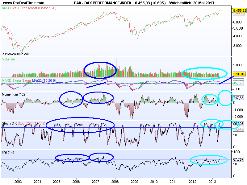 Sthenelos Mai 20, 2013 Dax Chartanalyse Update Zweiter Chart und die Indikatoren, mal etwas mit der Vergangenheit verglichen zur heißen Phase 2006-2008, wie man heur sieht, ist zumindest im Vergleich zu dieser Zeit noch nichts überkauft und im Vergleich zu dieser Zeit gab es auch noch keine Übertreibung. Ist man sehr bullish, so könnte man das weiterhin als enorme Stärke im Dax auslegen mit Kursziel 9000 und sogar bis zu 10000 - wie man sieht haben 2007 und 2008 (weekly) einige dieser Indikatoren über viele Monate, sogar bis zu einem Jahr und mehr im überkauften Bereich ausgeharrt - möglich ist es, ob es jetzt wieder so geschieht weiß man natürlich nicht. Was in einem halben Jahr oder Jahr sein wird, darüber will ich keine Prognose machen, man sieht aber an der Vergangenheit, was noch alles möglich sein kann, aber nicht muss. Diesen Beitrag teilen Link zum Beitrag