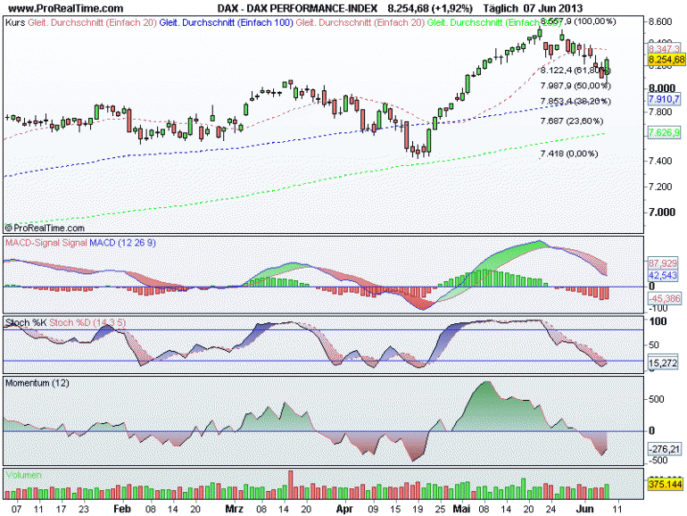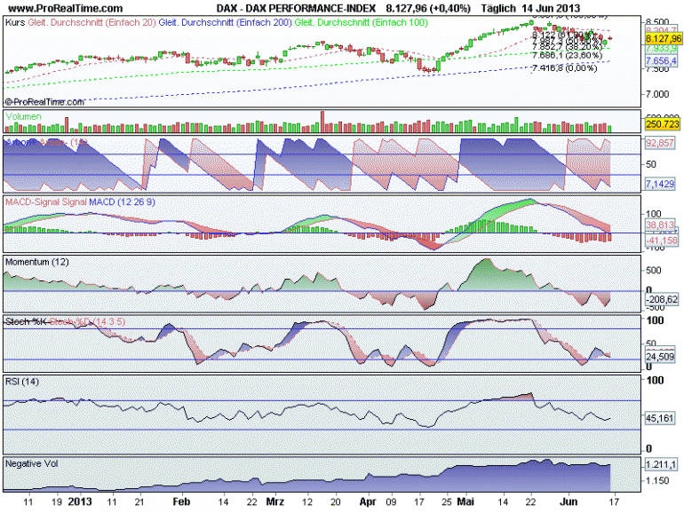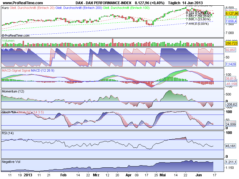 Sthenelos Juni 7, 2013 Alle Indikatoren sind mittelfristig noch bullish, weekly, monthly und quartalsweise. Nirgends Zeichen einer generellen Trenwende (Baisse) vorraus. Ich fress nen Besen, wenn wir nicht noch 9000 (von den Indikatoren sogar 10-11000) vor der nächsten Baisse sehen. Was nicht heißt, dass es zwischendurch nicht die üblichen Korrekturen geben kann über ein paar hundert Punkte. 2 Charts: 1. Quartalsweise 2. daily. Im Daily sieht man den Verlauf der bisherigen kleinen Korrektur. Im Stocha sieht man, dass der große Move vorbei ist, Momentum ebenso, MACD korrigiert im daily weiter, ist aber unwichtig, hier ist eher der Generaltrend im Weekly wichtig, der ist noch bullish. Einschätzung mit gewisser Toleranz: 1-2 Wo. Kurse zwischen ca. 8050-8300, dann 1-2 Wo. Upmove auf 8500 und oben raus übers ATH. Chart und Indikatoren geben es her und scheinen mir wahrscheinlicher als Kurse zwischen 7500-8000 innerhalb der nächste ca. 4 Wo. Diesen Beitrag teilen Link zum Beitrag