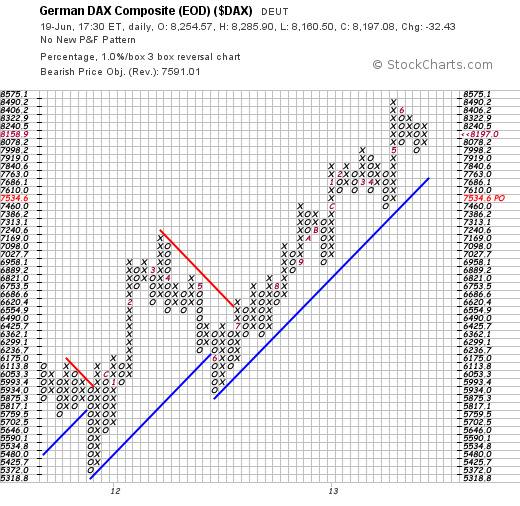 Chemstudent Juni 20, 2013 Prognose nächste Wo. schwer. Ich würde davon ausgehen, dass nächste Wo. nochmal 1-3 Tage zumgeeiere, wenns es ganz blöd läuft bis ca. 7850, sollte das aber schon in den nächsten 3 Tagen passieren ist das m.A. ein weiteres Zeichen der Schwäche. Die Stocha ist jetzt im Bereich, wo die nächste große Upwelle jeden Tag losbrechen kann, auch der MACD könnte bald fertig sein. Bedingt durch den dreifachen Hexensabatt nächsten Freitag bin ich mir über ziemlich sicher, dass es spätestens Mitte nächster Woche richtig volatil wird auf dem Märkten! Die Hoffnung ist, dass diese Schwäche jetzt genutzt wurde um nochmal groß einzukaufen und um anschliessend Dax und Dow über das ATH zu hieven. Das ist technisch und fundametal durchaus möglich und nicht selten verlaufen diese Verfallstage in Bullenmärkten sehr bullish. Die Frage ist, ob der Markt im Moment noch so bullish ist, denn es mehren sich die Anzeichen speziell im Weekly, dass dort die Zeit der Korrektur erst beginnt. Der Dax hat im weekly noch keine Verkaufssignale, der Dow als Leitindex ist aber schon in den Korrekturmodus geswitched, was in einem derart starken bullishen Trend nicht unbedingt Korrekturen bedeuten muss, aber allemal ist der Dow definitiv nicht mehr so stark wie vor ein paar Wochen und oftmals läuft der Dax dem Dow hinterher. Vermutung ist somit, dass es in nächster Zeit sehr volatil wird, den Hexensabatt und die darauf folgenden Tage sind wichtig, hält sich der Dax über 8400 oder gelingt im sogar das ATH dann stehen 9000 auf der Uhr. Gelingt das nicht, das ist jetzt m.A. die letzte Chance zum Ausbruch, dann dürfte der Dax in einen Seitwärtstrend fallen über den Sommer. Mein bullishes Wunschszenario ist bisher nicht eingetroffen, dafür das bearish Szenario. Anhand von Chart und Indikatoren war für mich wie gesagt keine klare Richtung erkennbar. Neuer Chart morgen oder WE. Deinen Beitrag sehe ich erst jetzt, bin ja hier eher selten. Schauen wir mal auf einen P&F Chart (du kennst das ja eigentlich schon ein bisschen): Double Bottom Breakdown am 13. Juni! Mit dem heutigen Tag erfolgte ein weiteres Sell-Signal. (im Chart noch nicht ersichtlich, da noch nicht aktualisiert) Diesen Beitrag teilen Link zum Beitrag