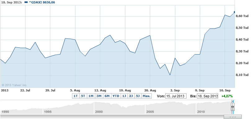 Ca$hflow September 19, 2013 · bearbeitet September 19, 2013 von Ca$hflow Warum? Wenn er von der kurzfristigen Perspektive bzw. zu dem in der Zeit vorliegenden Chancen-Risiko-Profil geredet hat, lag er gar nicht so falsch damit, denn seit dem 15. Juli lief der DAX in einer Seitwärtsbewegen zwischen 8200-8400. Der Ausbruch über die 8400 ist jetzt erst seit einer Woche im Gange. Diesen Beitrag teilen Link zum Beitrag