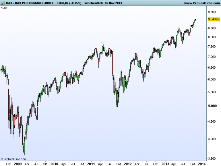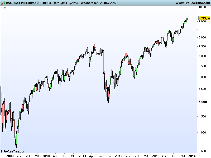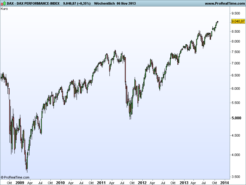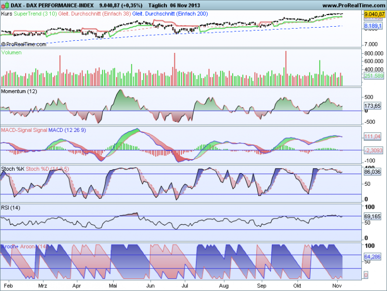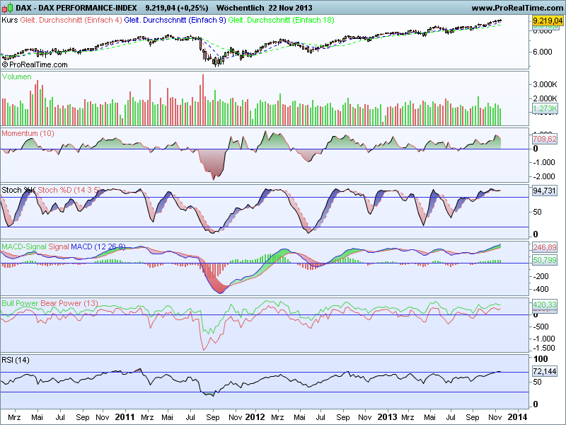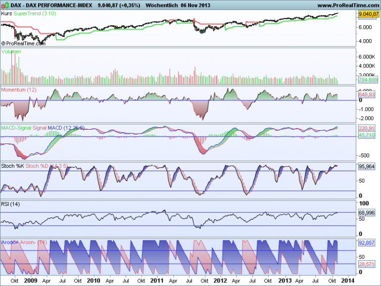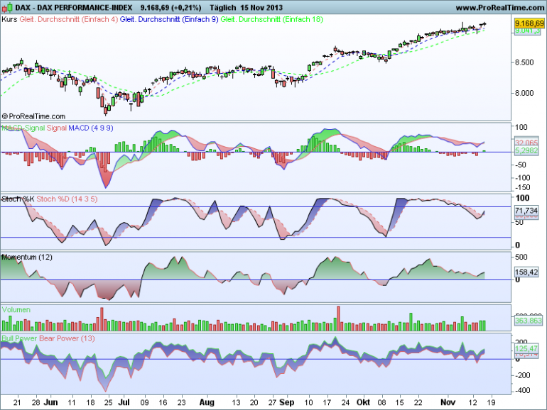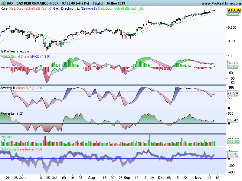 Sthenelos November 15, 2013 Update Daily Die Korrektur (siehe 7 Nov.) in den Indikatoren ist seit heute wieder vorbei und die nächsten Kaufsignale haben sich im Dax gebildet - im Dow schon vorgestern, besonders der weekly ist im Dow sehr bullish. Zurück zum Dax, wenn sich dieses Kaufsignal von heute bestätigt, wovon ich ausgehe, dann dürften wir technisch gesehen einen schönen Upmove nächste Woche sehen, mit sehr hoher Wahrscheinlichkeit. Diesen Beitrag teilen Link zum Beitrag