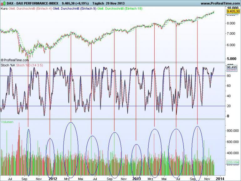 Sthenelos November 29, 2013 Daily heute kein Chart, es hatte sich letzte Wo. das besagte Signal gebildet, derzeit neutral und ich erkenne derzeit kein Signal das ich mit einer hohen Wahrscheinlichkeit interpretieren würde -> abwarten, bis es neue Signale gibt. Update ein weiteres Kaufsignal gabs im Lauf der Woche. Die Indikatoren im Daily deuten derzeit keine Änderung an, das Top kann sich jetzt ausbauen oder bestenfalls nochmal einen drauf setzen, konkrete Anzeichen einer Korrektur, sind im Moment noch nicht erkennbar. Dem Momentum kann man etwas Bedeutung zukommen lassen, neuer Höchstkurs im Index aber kein neues Top im Momentum. Das gilt als Ausstiegssignal, funktioniert aber nicht immer. Heute kein Chart dazu. Chart gibts heute - daily, zum großen Verfallstag, der am 20.12.2013 stattfindet. Dem großen Verfallstag kann man eine gewisse Bedeutung bemessen, kurzfristig. Die Märkte werden definitiv beeinflusst. Hier als Übersicht, alle Verfallstage seit Ende der Eurokrise bzw. seit der Aufwärtstrend intakt ist. Bei jedem Verfallstag erkennt man in der Stocha ein Kauf- oder Verkaufssignal. Notieren die Indikatoren im überkauften Bereich, tritt meistens ein Verkaufsignal auf und fallende Kurse sind kurzfristig wahrscheinlicher als steigende Kurse, notieren die Indikatoren im überverkauften Bereich, meistens ein Kaufsignal und steigende Kurse, ebenso kurzfristig. Die Wahrscheinlich für dieses Szerario ist da, aber nicht absolut, bzw. kann noch mit weiteren Indikatoren verfeinert werden. Schauen wir mal wo die Indikatoren ein paar Tage vor dem 20.12. stehen und was dann passiert. Diesen Beitrag teilen Link zum Beitrag