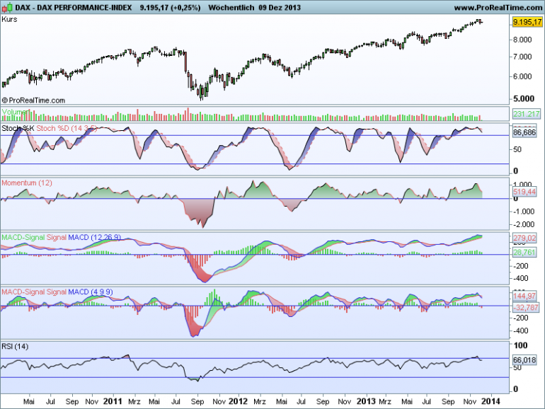 Sthenelos Dezember 10, 2013 Update Weekly: dort gab es Ende letzter Wo die ersten VK Signale bei den Indikatoren die jetzt, heute, m.A. bestätigt sind. Ich halte es für wahrscheinlich, dass wir - mit etwas Toleranz - bis Feb. 2014 keine Bullenparty mehr haben werden und fallend oder bestenfalls gleichbleibende Kurse sind wahrscheinlicher als steigende, was aber nicht heißt, dass es jetzt crashed, und auch kleine Upmoves sind durchaus möglich und normal. Der große Trend - für die nächsten 2-3 Monate ist m.A. technisch aber jetzt bearish. Meine Ziele kurzfristig nach heutigem Stand sind 8980, nächsten 2 Tage, bis Mitte/Ende nächster Wo. (Verfallstag 20.12.!) 8800 vermutlich eher gen 8600. Die Korrektur kann m.E. technisch bis ca. 8200 laufen im schlimmsten Fall, bis Februar, allerdings muss man die Indikatoren regelmäßig neu auswerten. Diesen Beitrag teilen Link zum Beitrag