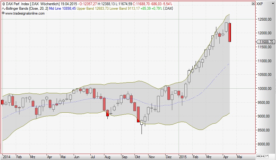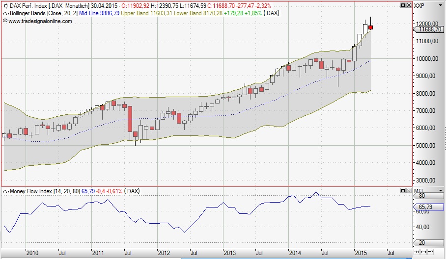 €-man April 19, 2015 Wenn wir einmal das nervöse Tagespickelbekommen weglassen und uns einen ruhigeren Blick gönnen, dann sehen wir den Abbau einer Übertreibung. Diese Übertreibung spiegelt sich auch im verhaltenen Verlauf des Money Flow Index. Weil sich der allergrößte Teil der Kursverläufe nun einmal innerhalb der Bollinger Bänder abspielen, ist eine Rückkehr in diesen Bereich keine wirkliche Sensation. Weil sich weiters die Mittellinie eines Bandes als Unterstützung (im Aufwärtstrend) anbietet und gleichzeitig die von Toni angesprochene 10.000 Punkte-Marke relevant wird, ist bis dorthin alles im grünen Bereich. Auf Wochenbasis haben wir eine Band-Unterstützung bei knapp unter 11.000 Punkten. Auch hier ist es nicht außergewöhnlich, dass in einem starken Trend Gegenbewegungen stattfinden. Letztlich entscheidend wird aber die globale Entwicklung werden, der sich der deutsche Leitindex so oder so nicht entziehen kann. Gruß €-man Diesen Beitrag teilen Link zum Beitrag