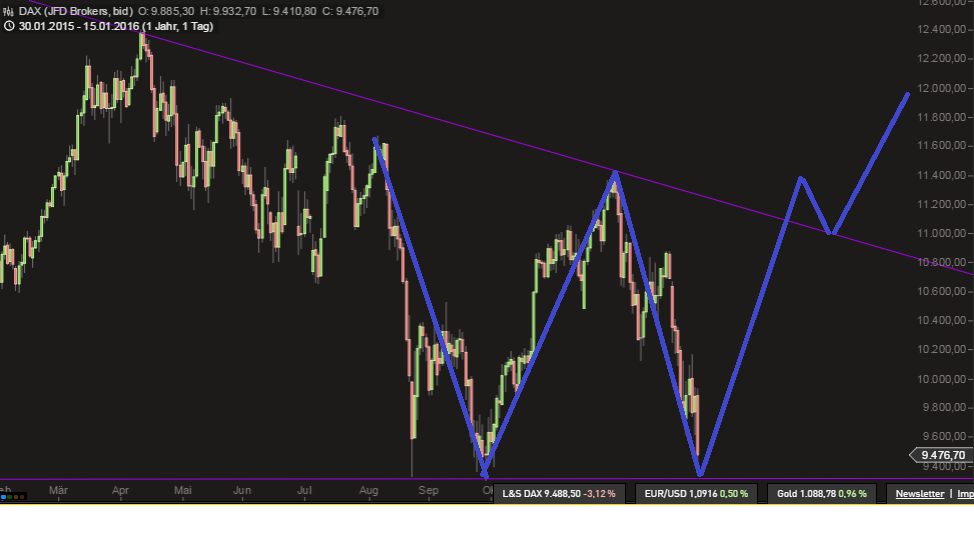 think.twice Januar 16, 2016 Hallo Zusammen, nach jahrelangem mitlesen, habe ich mich nun auch angemeldet und möchte gerne die Diskussion um die Dax Chartanalyse wieder etwas mit Leben füttern. Ich bin absoluter Leihe was das angeht, freue mich aber deshalb über jeden neuen Eintrag, welcher zum Nachdenken anregt. Besonders in der jetzigen Situation ist es umso spannender, in wieweit die Charttechnik Einfluss auf die weitere Kursgestaltung haben kann. Wenn ich mir den DAX so anschaue, gibt es der zeit viele Szenarien, welche sich entwickeln können. Voraussetzung für die zukünftige Weichenstellung, wird wohl das Jahrestief von 2015 haben. Hält dieser Bereich, könnten sich einige bullische Formationen ergeben. Bricht der Unterstützungsbereich kann es durchaus weiter tiefer gehen. Beim Blick auf den Chart finde ich die nachfolgende Formation sehr markant. Sollte es einen Doppelboden in der nächsten Woche geben und die FED das Ganze noch mit etwas Hilfe wieder unterstützen, wäre das ein sehr guter Weg. Was meint ihr? Diesen Beitrag teilen Link zum Beitrag