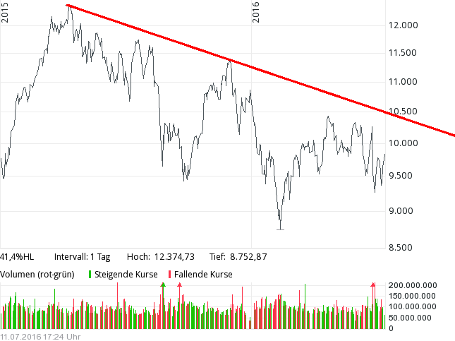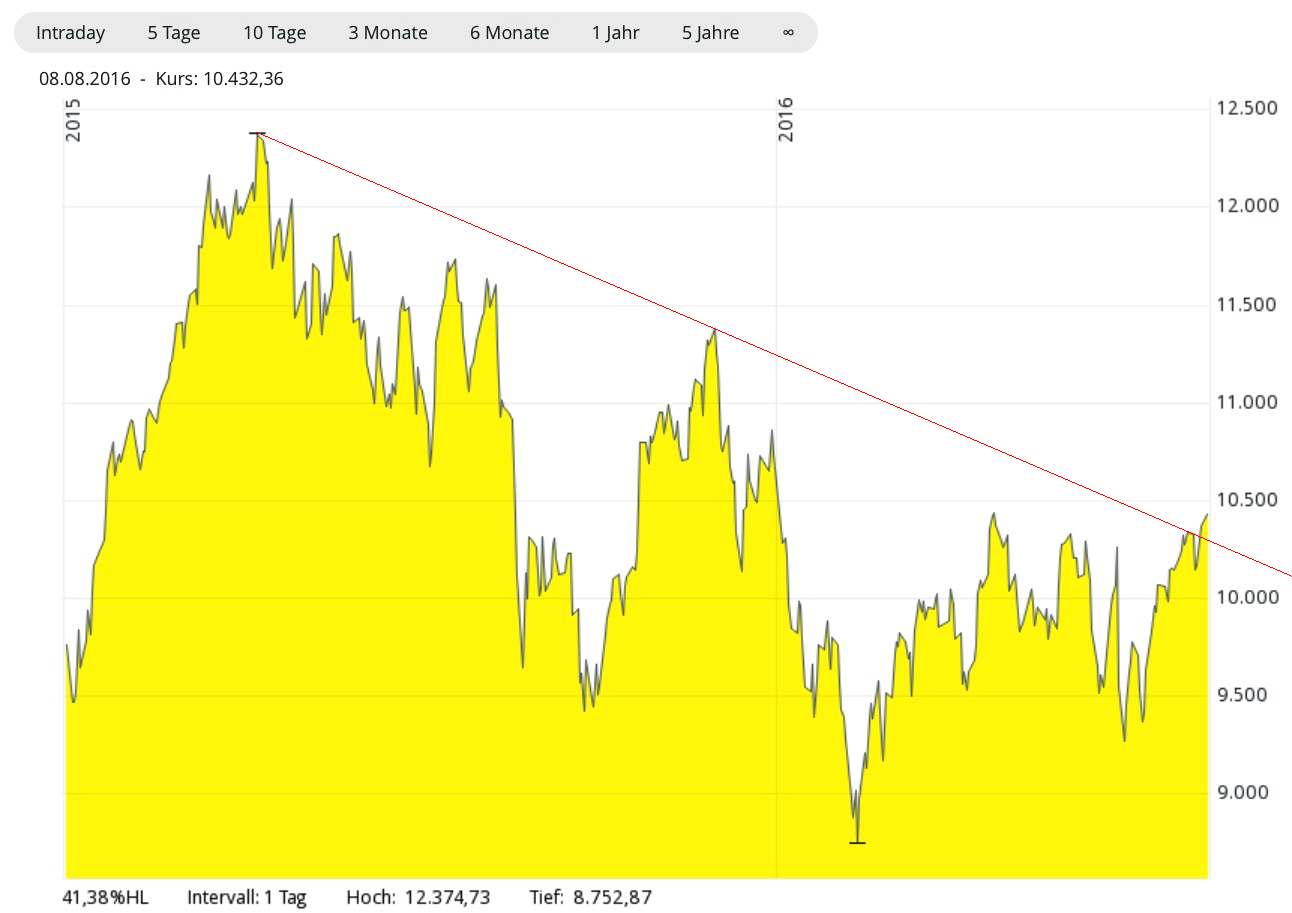 Toni April 20, 2016 · bearbeitet April 20, 2016 von Toni Ich weiss nicht, aus welcher Quelle ihr eure Charts nehmt, bei comdirect sieht der DAX jedenfalls so aus (Unterstützung (grün) und Abwärtstrends (rot) von mir ergänzt): Die Diskussion Für-und-Wider-Charttechnik gehört nicht in diesen Thread! Man kann dafür passendere Threads finden, die sich dieser Diskussion angenommen haben. Diesen Beitrag teilen Link zum Beitrag