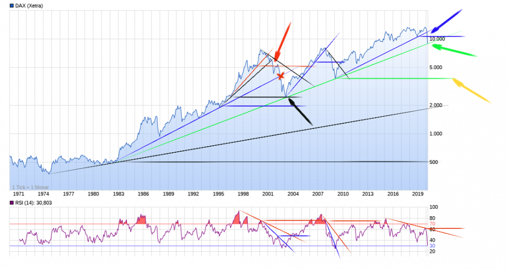 Aktiencrash März 21, 2020 Am 14.1.2019 um 21:17 von Aktiencrash: Die Trendlinie mit dem roten Pfeil ist unsere Ziellinie. Die untere Trendlinie kann zur Zeit nicht erreicht werden, denn dazu müßten 2 Dinge passieren. Geld und sämtlicher Besitz müsste zeitweise an Wert verlieren. Gut vorstellbar in einem Krieg oder bei massiven Steuererhöhungen. Beides ist zur Zeit nicht in Sicht. Ganz im Gegenteil, die Steuerzahler werden von der jetzigen Regierung gerade entlastet und so Geld in den Markt gespült. Ich weiß nicht ob ich lachen oder weinen soll, denn es ist genau das Szenario eingetreten was ich schon vor einem Jahr für den Dax prognostiziert habe und alles nur auf Grund von ein paar Indikatoren die negative Divergenzen im Dax-Chart ausgebildet haben. Unbedingt schwarzmalen möchte ich jetzt auch nicht, aber das chartechnische Bild für den Dax sieht alles andere als positiv aus. Fundamentale Unterstützung - Fehlanzeige. China hing 2,5 Monate in der Warteschleife und nun trifft es Europa und Deutschland. Zeitversetzt folgen nun Nordamerika, Südamerika und Afrika. Im dümmsten Fall hängt Europa ebenfalls 2 bis 2,5 Monate in dieser Warteschleife. Der Dax hat seine letzte horiz. Unterstützung (blau) bei ca. 10.560 Punkte wie ein scharfes Messer nach unten durchschnitten und ist nun auf dem langfristigen Aufwärtstrend (grün) bei ca. 9000 Punkte angekommen. Der RSI hat das Ende des Aufwärtstrend bereits zwischen 2015 und 2019 mit der Ausbildung einer neg. Divergenz vorweggenommen. Sucht man ähnliche Stellungen im Dax, richtet sich der Blick auf die Jahre ab 2001. Es ging durch die horiz. Unterstützung (rot) und im Anschluß durch den Aufwärtstrend (blau / rotes Kreuz). Der RSI hatte bereits zwischen 1997 und 2000 begonnen eine neg. Divergenz auszubilden. Das Ende war die nächste horiz. Unterstützung (schwarz) mit Ausbildung des neuen Aufwärtstrends (grün). Nun steht der Dax am Scheideweg. Wie hoch stehen die Chancen das man alle Virologen in den nächsten 2 Wochen für Idioten erklärt und die Produktion wieder anlaufen lässt ? Meiner Meinung stehen die Chancen bei Null. Somit werden sich die Lager weiter leeren und fast jeder der jetzt noch produziert die Produktion auf Grund von Materialmangel einstellen müssen. Ich will mir gar nicht erst vorstellen wie lange große Autokonzerne brauchen um ihre Produktion wieder voll hochzufahren. Da sind einige LKW-Ladungen an Material nötig. Im Anschluss wird versucht alle nicht stornierten Aufträge abzuwickeln. Investitionen werden zum größten Teil gestrichen und am Ende folgt die Rationalisierung. Folge, steigende Arbeitslosigkeit. Bevor eine horiz. Unterstützung in der Vergangenheit durchbrochen wurde, hat sich im Vorfeld auf Monatsbasis immer ein Abwärtstrend gebildet. Bisher fällt der Dax auf dieser Basis nur wie ein Stein. Ein Abwärtstrend ist bisher nicht zu sehen. Somit lässt sich bisher auch nicht genau abschätzen wohin die Reise geht. Langfristig schätze ich die Lage noch als neutral ein, aber das kann sich in 1 bis 2 Wochen ändern. Diesen Beitrag teilen Link zum Beitrag