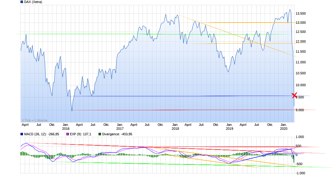 Aktiencrash März 22, 2020 vor 9 Stunden von SPIC06: Hallo Aktiencrash, vielen Dank für deine ausführliche Darstellung, welche ich sehr interessant finde. Der DAX ist in der letzten Woche mehrmals unter die 8300er Marke. Wäre somit nicht der neu ausgebildete Aufwärtstrend (grün) durchbrochen? Oder anders gefragt, wann wäre der Aufwärtstrend gebrochen und ein signifikanter Abwärtstrend eingeleitet? Vielen Dank für deine Antwort im Voraus. Servus SPIC06, der Aufwärtstrend (grün) ist noch intakt, da es sich um einen Chart auf Montasbasis handelt. Wir haben somit noch 7 Handelstage bis die Rechnung gemacht werden kann. Der Aufwärtstrend (grün) wäre im Eimer, wenn der Dax darunter schließt. Einen "Abwärtstrend" kann man auf Monatsbasis bisher überhaupt nicht erkennen. Der Dax fällt seit dem ATH wie ein Stein ins bodenlose und hat dabei eine immense Abwärtsdynamik entwickelt. Der RSI steht jetzt um die 30 und hätte somit noch etwas Luft nach unten bis zum Monatsende. Betrachtet man sich das ganze am Tagesschart kann ich mir zur Zeit nur 3 mögliche Szenarien vorstellen die alle für einen neuen Tiefstkurs sprechen. Diesen Beitrag teilen Link zum Beitrag