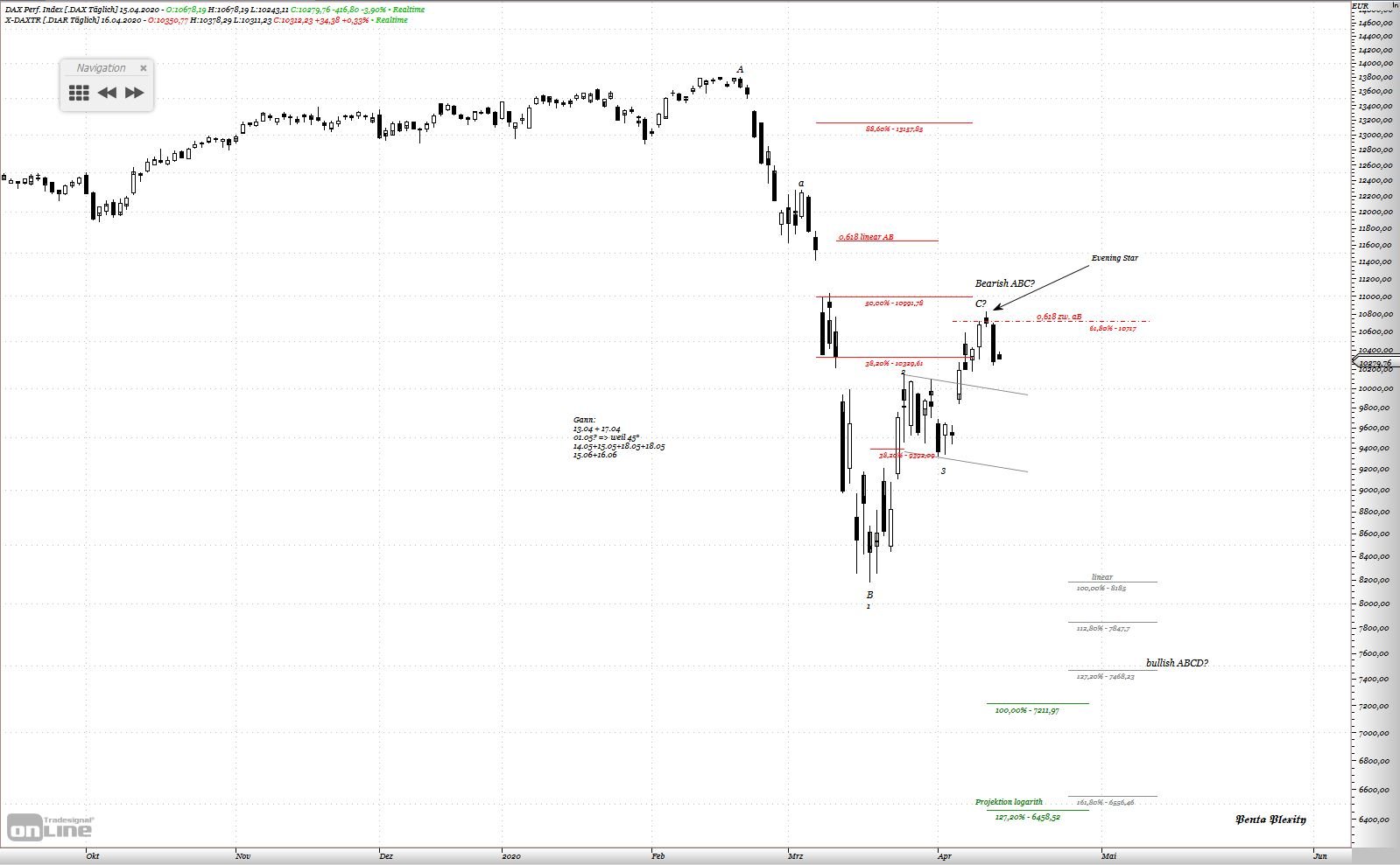 Penta Plexity April 16, 2020 vor 21 Minuten von Peter Grimes: Warum sollten die nicht mehr kommen? Meinst Du, wir bleiben ewig bei den 10.200 und irgendwas von heute morgen stehen? Davon abgesehen, dass DAX dabei ist, wie ich schon geschieben habe, die zweite Welle nach unten einzuleiten (mittelfristig, also Zeitrahmen 1-3 Monate). Die Frage ist, wo macht er sein letzten Hoch? Evening Star ist eigentlich ein zuverlässiges bearisches Candlestick Muster und bildet mit seinem Hoch ein Widerstand. Darüberhinaus ist das Niveau wichtig, wo diese Formation zu stande kam. Diesen Beitrag teilen Link zum Beitrag