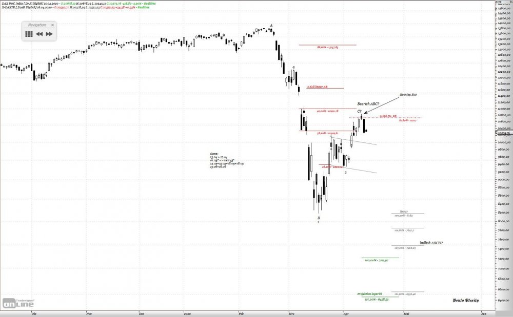 Penta Plexity April 12, 2020 Hallo Tradergemeinschaft, wie sagt man? Auf einem Bein steht man nicht? So auch für DAX, es fehlt noch die zweite Welle nach unten. Ca. 11.600 ist perfekter Bereich, um eine Erholung für ein harmonisches Pattern abzuschließen. Darauf deutet auch 4 Std Chart hin Diesen Beitrag teilen Link zum Beitrag