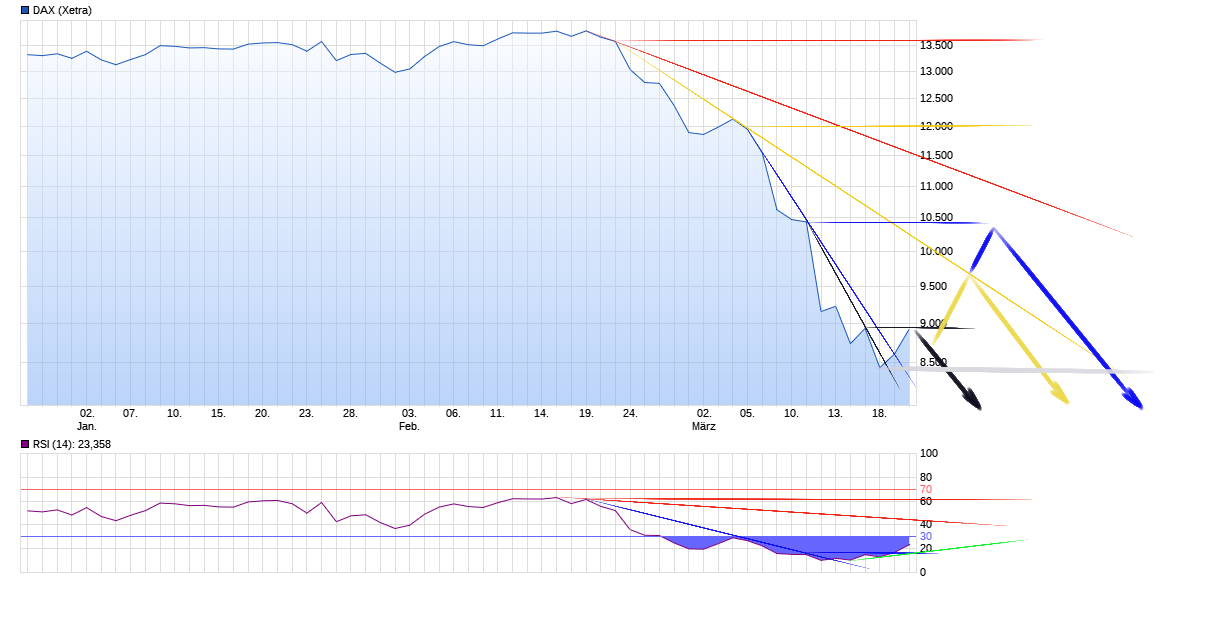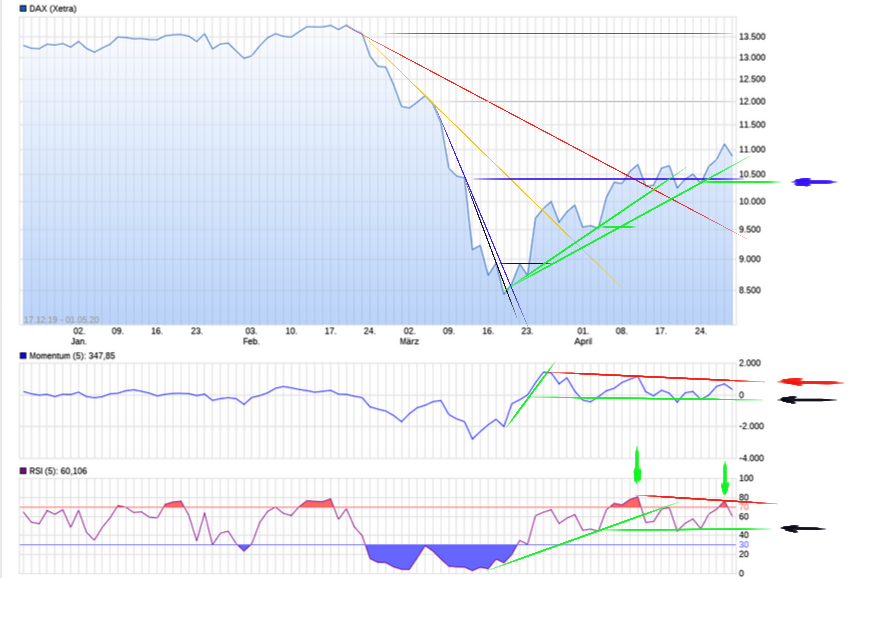 Aktiencrash Mai 1, 2020 Am 22.3.2020 um 02:36 von Aktiencrash: Servus SPIC06, der Aufwärtstrend (grün) ist noch intakt, da es sich um einen Chart auf Montasbasis handelt. Wir haben somit noch 7 Handelstage bis die Rechnung gemacht werden kann. Der Aufwärtstrend (grün) wäre im Eimer, wenn der Dax darunter schließt. Einen "Abwärtstrend" kann man auf Monatsbasis bisher überhaupt nicht erkennen. Der Dax fällt seit dem ATH wie ein Stein ins bodenlose und hat dabei eine immense Abwärtsdynamik entwickelt. Der RSI steht jetzt um die 30 und hätte somit noch etwas Luft nach unten bis zum Monatsende. Betrachtet man sich das ganze am Tagesschart kann ich mir zur Zeit nur 3 mögliche Szenarien vorstellen die alle für einen neuen Tiefstkurs sprechen. Der Dax ist vom ATT (ca. 8.500) nun bis in den Widerstandsbereich von ca. 10.500 Punkte vorgedrungen. Betrachtet man den Dax im Bereich der Widerstandszone von 10.500 Punkte auf Tagesbasis und unterlegt ihn mit dem Momentum (5), dann zeigt sich sehr deutlich das sich die anfänglich starke Aufwärtsdynamik abbaut, denn seit dem 10. April hat sich dort ganz klar eine neg. Divergenz herausgebildet (Pfeil rot). Noch nicht ganz eindeutig ist die neg. Divergenz im RSI (5) ersichtlich, aber sie lässt sich bereits erahnen (Pfeile grün). Beide Indikatoren halten sich knapp über ihren horiz. Unterstützungen (Pfeil schwarz), deren Linien knapp unterhalb von 0 (Mom) und 50 (RSI) liegen, eher ein neg. als ein pos. Zeichen. Lägen diese Linien oberhalb dieser Bereiche spräche das für eine starke Aufwärtsdynamik und ein fortsetzen des Aufwärtstrends nach Norden. Im jetzigen Fall spricht auf Tagesbasis dagen alles für ein erreichen des Gipfels. Der letzte Unterstützungsbereich für den Dax liegt nun ebenfalls im Bereich 10.500 Punkte (Pfeil blau).Fazit: Aus charttechnischer Sicht sollte sich der Dax nun langsam dem Gipfel der kleinen Anhöhe angenähert haben und den Rückzug nach Süden antreten. Diesen Beitrag teilen Link zum Beitrag