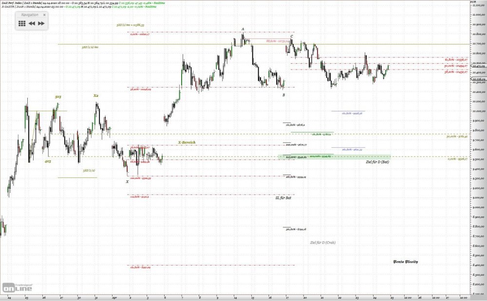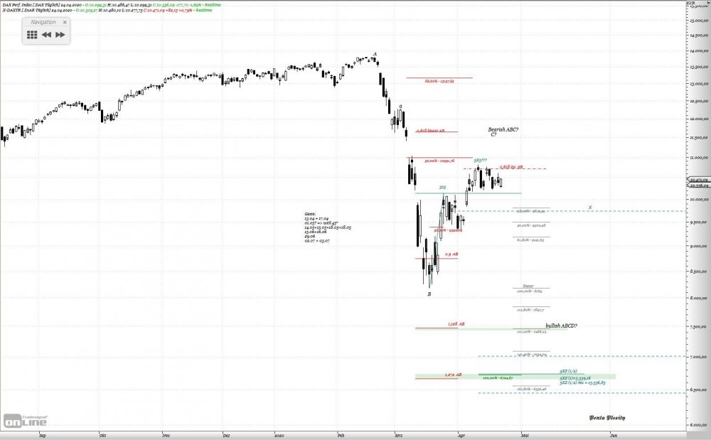 Penta Plexity April 25, 2020 Hallo Tradergemeinde, anbei die Bunte Striche und Chartformationen. Nach wie vor, gehe ich persönlich von einer Abwärtsbewegung aus. Bevorzugtes Szenario: direktes Anlaufen der Marke 7.500 gerät jedoch in Gefahr. Stundenchart DAX+XDAX. Nach dem 5XZ (1/2) inv bei ca. 10.700 erreicht wurde, müsste Kurs bis in den X-Bereich des 5X Musters (25.04 bis 26.04) korrigieren. Den Regeln der harmonischen Pattern, entstand bis zum 17.04 ein Muster, welches bei ca. 9.500 (Übereinstimmung mit X-Sequentials!!!) sein letzten Tief und endgültigen Abschluss zu erwarten hätte. Im Klartext: sollte DAX auf 9.500 fallen und dort Unterstützung finden – Long Szenario. Was im Stundenchart Abschluss eines Patterns ist, wäre im 4 Std. Chart lediglich Zwischenziel für ein bearishes Muster. PRZ D müsste dann um ca. 11.400 liegen, entgültig kann man das Ziel für PRZ D erst projezieren, wenn C fest steht. Aber interessant ist, dass das 5XZ (1) inv. (Stundenchart) aus X-Sequentials an 11.386,33 Punkten liegt, also in der Nähe von 11.400 (Übereinstimmung???) Da DAX sowieso alles macht, nur das nicht, was man von ihm erwartet , wären alle Szenarien vom Tisch, wenn das Hoch vom 14.04 überboten wird. Diesen Beitrag teilen Link zum Beitrag