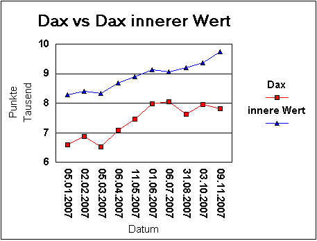 Aktiencrash November 11, 2007 Heute mal wieder etwas aus meiner kulinarischen Küche Charttechnisch sieht es weiterhin gut für den Dax aus. Der sekundäre Aufwärtstrend (schwarz gestrichelt) ist zwar durchbrochen, aber noch besteht kein Grund zur Panik, denn den der horiz. Unterstützungsbereich liegt in großer Entfernung bei 6579 Punkten. Der primäre Unterstützungsbereich (grün) liegt weiterhin bei 5422 Punkte. Die Indikatoren stehen zur Zeit auf Seitwärtstrend / Abwärtstrend, denn es haben sich neg. Divergenzen (rot) ausgebildet, die eine Abschwächung in der Aufwärtsdynamik vorwegnehmen. Im ganzen erinnert mich das Szenario an das Jahr 2004 (Kreis rot), als der Dax in einem leichten Seitwärtstrend / Abwärtstrend für längere Zeit verbrachte. Für genauere Erklärung zur Trendliniensetztung bitte hier nachschlagen: https://www.wertpapier-forum.de/index.php?s...ost&p=42676 Im weiteren habe ich mal den Vergleichschart Dax vs. Umsatzrenditewachstum weiter vervollständigt. Enthalten sind jetzt: -Continental -Daimler -Dt. Bank -Dt. Börse -Lufthansa -MAN -SAP -VW ------------------ Neu: -Adidas -Merck -BASF -Bayer -BMW -Deutsche Post -Deutsche Telekom -Siemens -ThyssenKrupp -TUI Mit Beginn des Geschäftsjahrs 2007 basiert die Siemens-Finanzberichterstattung vollständig auf International Financial Reporting Standards (IFRS). Die Vorjahresdaten sind an IFRS angepasst worden. Ich habe das Geschäftsjahr 2006 daher mit abgeändert. Aus dieser Änderung ergibt sich nun für 2006 eine höhere Umsatzrendite für die Dax-Untermehmen von 5,51 % (vorher 5,38 %). Interessant ist die Entwicklung Dax zur Umsatzrenditesteigerung in folgender Hinsicht. Dax Schlußstand 2005 = 5408,26 Punkte --- Umsatzrenditewachstum 2006 = 12,65 % --- Ergebnis 684,14 Punkte Dax Schlußstand 2006 = 6596,92 Punkte --- Umsatzrenditewachstum 2007 geschätzt = 16 % --- Ergebnis 1055,51 Punkte Das letztere würde einen Punktestand von 7652,43 Punkte für 2007 bedeuten, den der Dax bereits überschritten hat. Setzt man ein Umsatzrenditewachstum von 10 % für 2008 an, dann würde beim einem Ausgangswert von 7652,43 Punkte das Kursziel bei 8417,67 Punkte liegen. Immerhin sehen einige Wirtschaftsexperten ein abflauen des Wirtschaftswachstums für 2008, da dürften 10 % ein guter Schätzwert sein. Nachdem ich die neuen Werte ergänzt habe, steigt die Umsatzrendite für das 3. Quartal auf 6,42 % (vorher 6,01 %). Damit erhöht sich das Umsatzrenditewachstum auf 16,39 % (vorher 11,57 %). Der Dax vs. Dax innere Wert Chart beginnt wieder kräftig zu steigen. Das liegt vor allem daran das ich jetzt die Gewinnschätzung für 2008 (Quelle Börse-Online) verwendet habe die bis jetzt höher ausfallen wie 2007. Zum anderen ist die Anleiherendite kräftig gefallen. Der innere Wert für den Dax ist auf 9759,20 Punkte (vorher 9382,60 Punkte) angestiegen. Tendenziell nehme ich an das die Anleihenrendite sich in Zunkunft wieder Richtung 5 %-Marke bewegen wird, was den inneren Wert wieder sinken lassen sollte. Das Dax-KGV 2008 liegt bei 14,88 was noch als günstig anzusehen ist. Fazit: Langfristig sieht es charttechnisch sehr gut aus für den Dax. Nur mittelfristig ergibt sich aus Indikatorensicht eine kleine Verschnaufpause die sich nun im Bereich ATH und 6579 Punkte abspielen wird. Von der fundamentalen Front kommen bisher gesehen nur positive Daten. Die Gesamtumsatzrendite 2007 liegt bisher über Vorjahresniveau. Diesen Beitrag teilen Link zum Beitrag