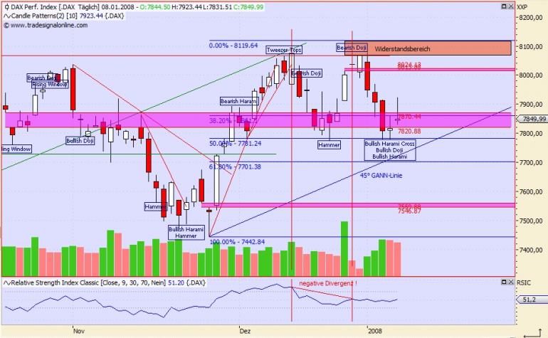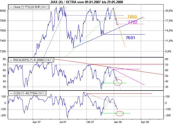 Aktiencrash Januar 15, 2008 Laut RSI und CCI hat der DAX noch ein gutes Stück nach Süden vor sich. Erst nach erreichen (Kreis rot) der horiz. Unterstützungen (grün) in beiden Indikatoren, ist die Lage langsam aber sicher überverkauft und ein Boden kann sich ausbilden. Die letzte horiz. Unterstützung befindet sich im Augenblick bei 7531 Punkte. Widerstände gibt es vorläufig bei 7850 Punkte und bei Ausbildung des neuen Tiefs in den kommenden Tagen bei 7732 Punkte. Fazit: Kurzfristig geht es noch mal Richtung Süden. Der Boden ist im Tageschart noch nicht auszumachen. Mittel.- und langfristig steht weiterhin für den Dax noch alles auf steigende Kurse . Diesen Beitrag teilen Link zum Beitrag