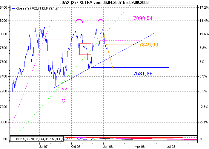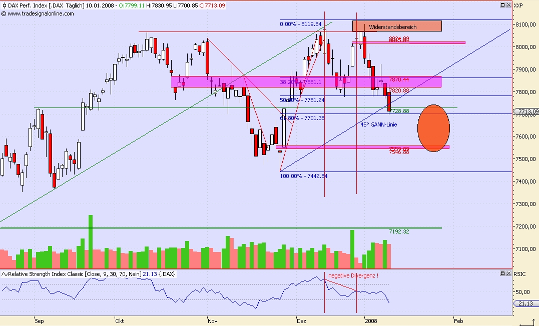 Onassis Januar 11, 2008 Wenn ich den DAX so anschaue, ist momentan nichts zu erkennen, warum der Abwärtstrend sich beenden sollte. Der DAX hat heute haargenau auf dem 62% retracement gedreht. Da soll mir doch einer sagen, das ist alles Zufall das die 50er und 62er retracement Linie eine besondere Bedeutung hat. Der 7.700er Berecih ist eigentlich eine wichtige Unterstützung - die heute vorerst gehalten hat. Sollte der DAX weiter schwächeln, ist als nächstes Ziel die 7.550 (ehemaliges window/gap) an zu visieren (siehe rotes Oval). Danach folgt die psychologische 7.500 und dann das markante Tagestief vom 27.11.07 bei 7.444 Punkten. Zusammenfassend ist der Bereich von 7.550 - 7.450 eine große Hilfe und eine Unterstützung, die meiner Meinung nach absolut halten sollte. Wenn nein, kommt als letzte Hilfe nur noch das Tief vom 17.8.07 bei ca. 7.200. Aber daran will ich wirklich nicht denken. Ist auch sehr unwahrscheinlich, das der DAX so stark nachgibt. Meine Meinung: Dax dreht jetzt bei 7.700 - 20% Dax dreht bei ungefähr 7.500 - 70% Dax fällt kräftig unter 7.500 - 10% Onassis Diesen Beitrag teilen Link zum Beitrag