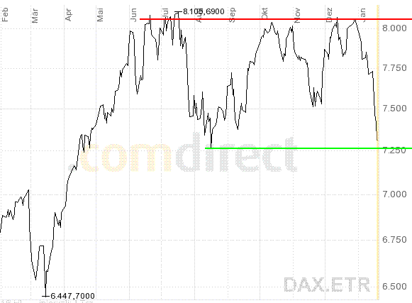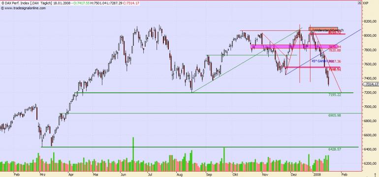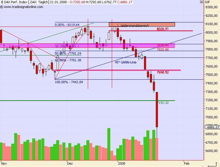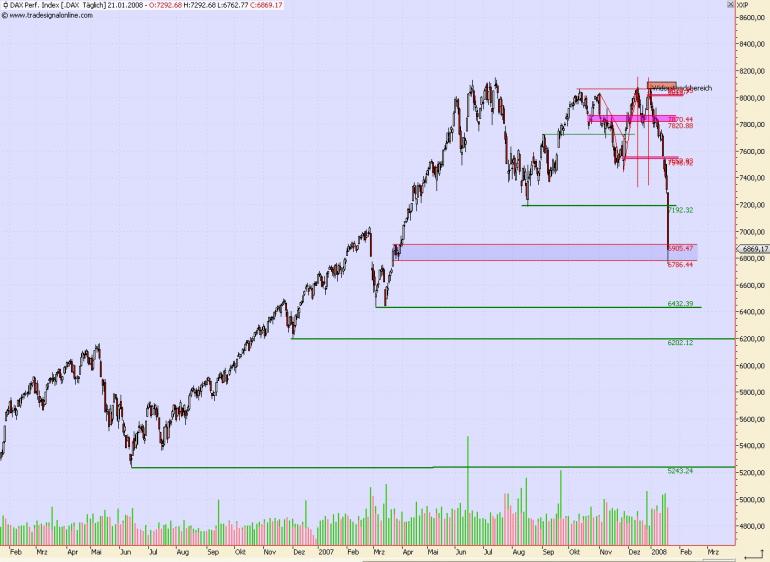 Onassis Januar 20, 2008 Einen kurzen Blick auf den DAX: Man kann deutlich sehen, das die Unterstützung bei 7.195 etwas Besonderes ist. Dort war nämlich das Tagestief Mitte August und hat somit einen markanten Punkt ins Leben gerufen. Danach mit schwächerer Wirkung folgt die Unterstützung bei ca. 6.900 und danach, wieder mit extrem starker Wirkung die Unterstützung bei ca. 6.430 Ich gehe davon aus, das die 7.200 erstmal halten und eine positive Gegenbewegung erfolgen wird. Zudem sind die Umsätze in den letzten Tagen angestiegen. Das ist immer noch kein "lehrbuchartiger" Ausverkauf gewesen, aber ich denke, dass die "große Menge" hat sich dennoch bereits von ihrer long Position verabschiedet. Onassis Diesen Beitrag teilen Link zum Beitrag