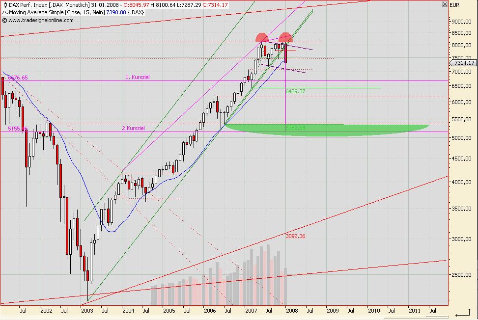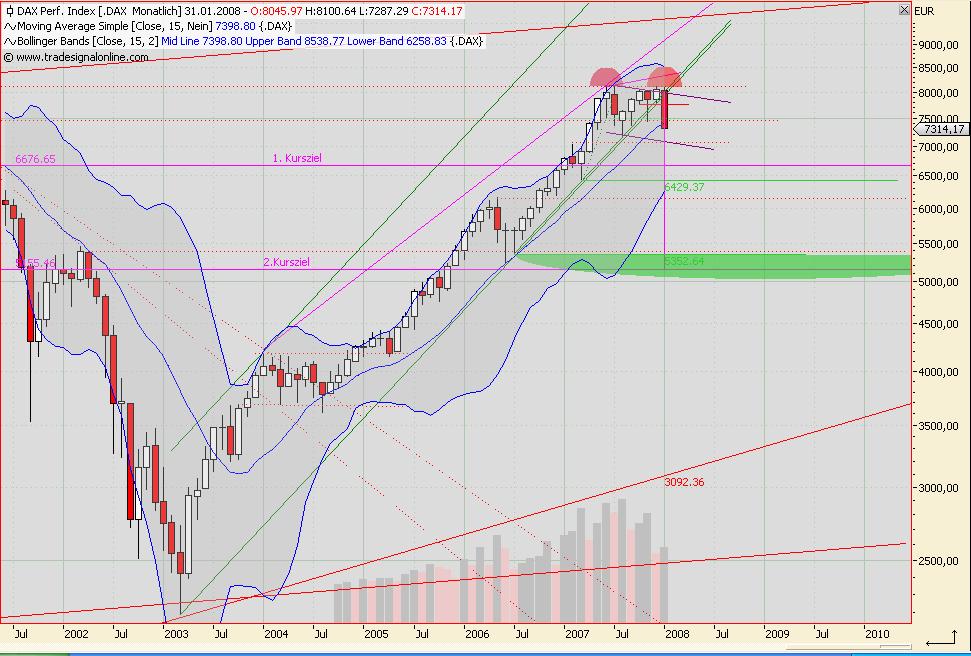reza Januar 18, 2008 Risikoaverseanleger sollten weiterhin von Aktien in Renten(Termingelder) umschichten nach meiner charttechnischen Einschätzung, hier die Begründung: Im Candlestick monthly sehen wir ein sehr mieses Bild, insofern am 31.01 bei dem jetzigen Stand(oder noch schlechter geclosed) wird: Wir haben dann zwei Kursziele, sowie noch die entscheidenden Supports, die nach unten absichern, legen wir nun den BBD15er darüber, den ich für den Monthly benutze, ergibt sich folgendes Bild: Daraus folgendern würde ich entweder jetzt weiter meinen Aktienanteil runterfahren oder noch bis zum 31.01 warten, um den definitiven Monatsschlusskurs abzuwarten. Das ist insofern "Geschmackssache" oder auch "Bauchgefühl" Wie bereits gesagt, ist die einzige Einschränkung, dass es am 31.01 immer noch so aussieht... =) Dementsprechend allen kurz, mittel, sowie langfristigen Anlegern viel Erfolg, ich melde mich zurück, sobald ich a) die 100000 Bachelor-Klausuren geschrieben habe und | oder ich etwas neues, gravierendes erkenne.... Diesen Beitrag teilen Link zum Beitrag