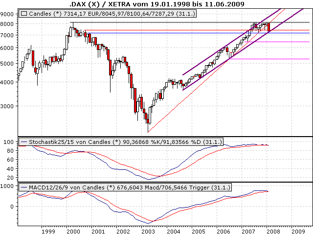 et3rn1ty Januar 19, 2008 Auch ich möchte mich mal an eine vorsichtige Analyse wagen. Im Bild ist der Dax auf Monatsbasis mit den Indikatoren MACD und Stochastik. Der Lage im Dax sieht alles andere als gut aus. Sowohl MACD und Stochastik haben auf langfristige Sicht in diesem Monat Verkaufssignale generiert. Ein Blick in die Vergangenheit zeigt, dass diese Verkaufssignale durchaus ernst genommen werden sollten. Auch im Dax-Chart selbst sieht es wenig rosig aus. Zur Zeit kämpft er mit der Verteidigung seiner Kreuzunterstützung - resultierend aus Trendkanal (violett) und Unterstützung (blau) - bei ca. 7.185,66 Punkten. Mit Bruch dieser Marke befinden sich die nächsten Haltepunkte bei ca. 6437,25 und 5243,71 Punkten. Da die Indikatoren bereits auf Verkaufen umgeschaltet haben, gehe ich davon aus, dass die Kreuzunterstützung auf Monatsbasis nicht gehalten werden kann. Somit dürfte die Richtung für die kommende Monate deutlich vorgegeben sein. Mein Tipp: Anschnallen und vorsichtig short gehen. Diesen Beitrag teilen Link zum Beitrag