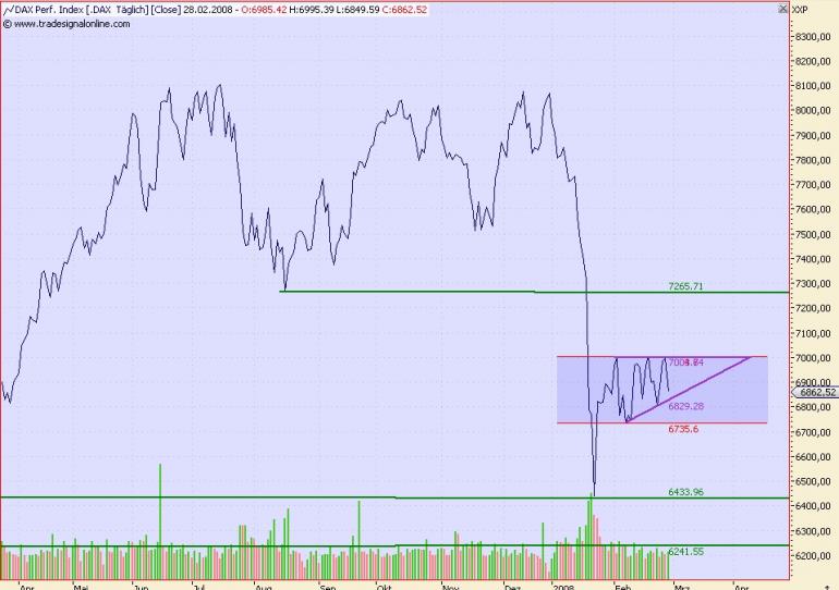 Onassis Februar 28, 2008 Hallo Leute, nach kurzer Abstinenz aufgrund meiner Website und dem vielen daytrading, mal wieder einen längeren Blick auf den DAX! Ich erkenne zwei Formationen: 1) Ein Rechteck 2) Ein aufsteigendes Dreieck (lila Linien) Zu 1): Das Rechteck hat 3x an der 7.00er Linie angeklopft. Damit wird dieser Widerstand immer härter und fester. Je öfter der DAX es nicht schafft bei den 7.000 nach oben durchzubrechen, desto geringer wird die Wahrscheinlichkeit, das er es mal schafft. Zudem steht ein Rechteck für die Fortsetzung der vorangegangenen Bewegung. Dies deutet darauf hin, das der DAX bei 6.750 nach unten durchbrechen kann. Nun zu 2): Ein aufsteigendes Dreick steht als bullisches Zeichen. Die Kurse fallen, aber der neue Tiefpunkt ist immer höher als der vorangegangene Tiefpunkt. Der DAX drückt sich quasi von unten an die 7.000er Linie dran, bis er keinen Platz mehr hat und nach oben durchbrechen muss! Welches Formation hat nun "Recht"? Welche Deutung wird wahr? Ich kann es wirklich nicht nicht sagen! Vom Bauchgefühl her tendiere ich zum Dreieck, also das der DAX in 2-3 Wochen die 7.000 nach oben durchbricht. Aber jetzt long einsteigen - ich weiß nicht... Es ist alles "very very fleeting"! Onassis Diesen Beitrag teilen Link zum Beitrag