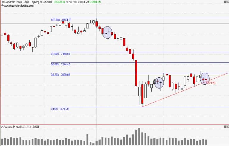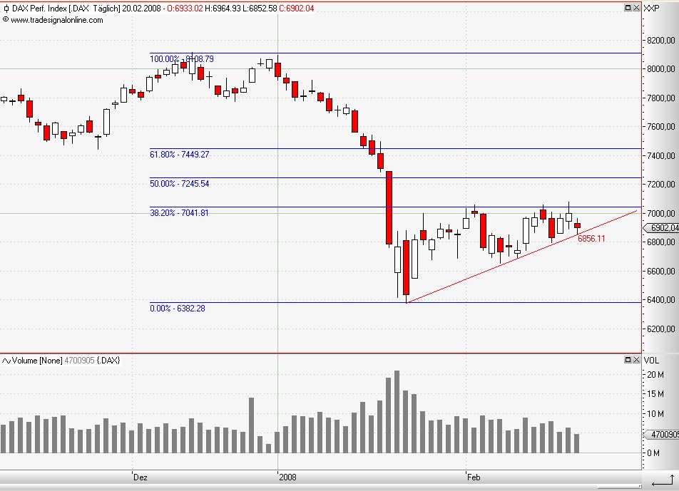 steff123 Februar 20, 2008 · bearbeitet Februar 20, 2008 von steff123 Auch wenn das hier wie der Musterfall eines aufsteigendes Dreiecks aussieht, mit oberer Begrenzung genau an der 38.2% Linie und wirklich sauberen Tests aller Linien mag ich dem DAX nicht so recht zutrauen nach oben auszubrechen. Außerdem verläuft auf gleicher Höhe das 38er Retracement der Aufwärtsbewegung von Juni 2006 bis zum ATH. Diesen Beitrag teilen Link zum Beitrag