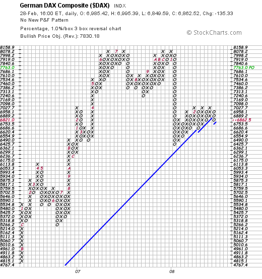 Chemstudent Februar 29, 2008 Habe den Chart von Onassis genommen. Waren gerade eben schon bei 6711. Vielleicht ist es auch nur ne Bärenfalle. Laut dem P&F Chart zeigt die Kompassnadel nach Süden. Heute wurde ein Verkaufssignal ausgelöst (ist im Chart noch nicht zu sehen, denkt euch ein weiteres "o" im Kästchen 6753,5). Ich bin mal mit ein paar Short-Zertis rein. Den Stop hab ich gemäß den P&F Regeln bei 7110 Punkte gelegt. (hätte eigentlich 7098 sein müssen, da er dann das Triple-Top bricht. ) Drückt mir die Daumen. Diesen Beitrag teilen Link zum Beitrag