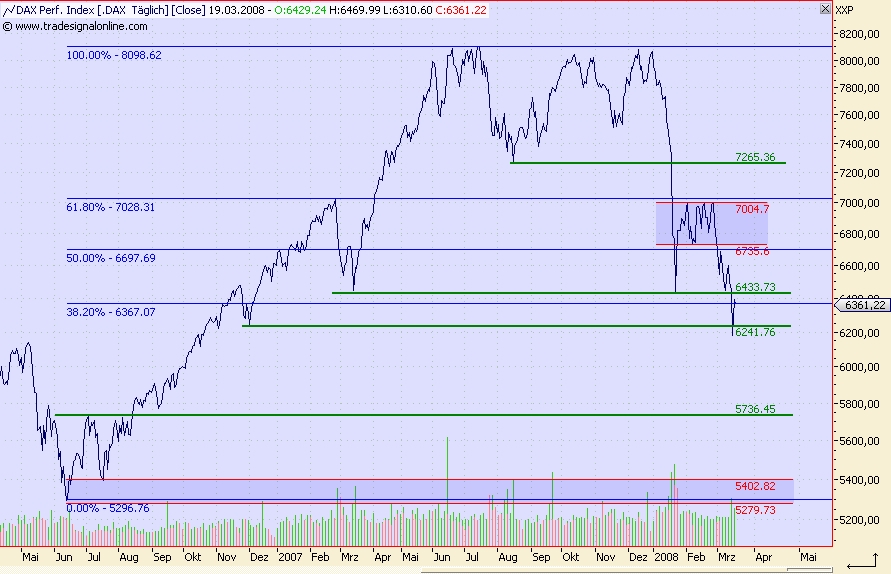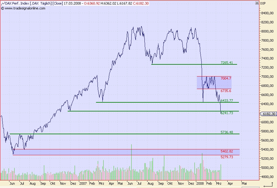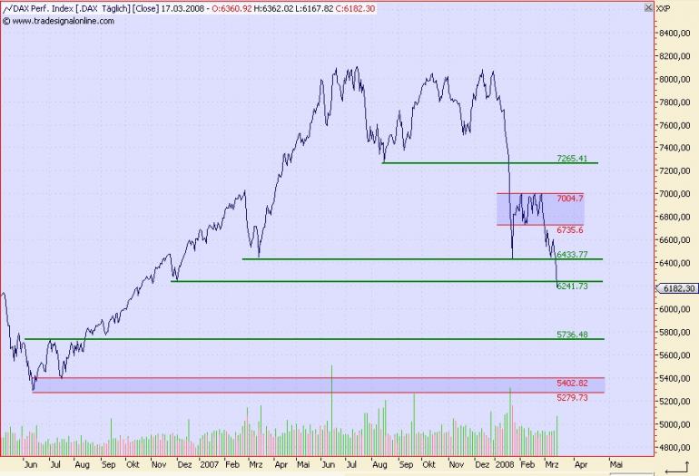 Onassis März 17, 2008 Hi Leute, die Unterstützung bei 6.433 ist durchbrochen worden, so wie ein heißes Messer durch die Butter geht. Zudem ist die nächste Unterstützung bei 6.241 enbenfalls per 17:45 Uhr geknackt worden. Nachbörslich ist der DAX zwar wieder gestiegen, aber das dürfte nur eine Gegenreaktion sein. Der heutige Umsatz, obwohl er gestiegen ist gegenüber den letzten Tagen, ist bei einem Abschlag von über 4% zu gering, als das man von einem Ausverkauf sprechen kann. Nach Ostern könnte der DAX durchaus auf die psychologische Marke von 6.000 rutschen und danach auf 5.736. Jetzt einzukaufen dürfen nur diejenigen, die Angst haben etwas zu verpassen - und dann nur max. 10% vom Gesamtkapital investieren! Alle anderen sollte noch warten. Erst im Bereich von 5.200 - 5.400 würde ich wieder den Geldschrank öffnen und mich in den Markt einkaufen! Allerdings auch hier erst langsam und vorsichtig, um zu testen, ob dieser Unterstützungbereich längerfristig hält! Onassis Diesen Beitrag teilen Link zum Beitrag