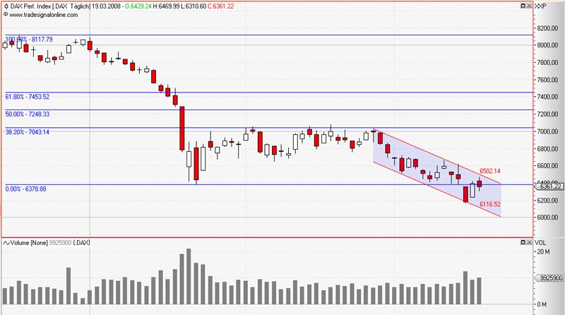 delubac März 19, 2008 Mir scheint als befände sich der DAX schon einige zeit in einem sekundären Abwärtstrend, der bisher ziemlich genau eingehalten wurde. Für die nächsten Tage dürfte demnach die Kreuzung aus Trendkanal und jetzt Widerstand vom letzten Downmove zum Test anstehen. Das Volumen ist zwar angestiegen, war aber bisher bei den Abwärtsbewegungen stärker als bei den Aufwärtsbewegungen. Wenn man hier überhaupt Progonose wagen kann so finde ich siehts nicht wirklich gut aus. Für den Gang nach Norden konnte ich nämlich überhaupt keine Anhaltspunkte finden... Diesen Beitrag teilen Link zum Beitrag