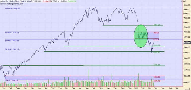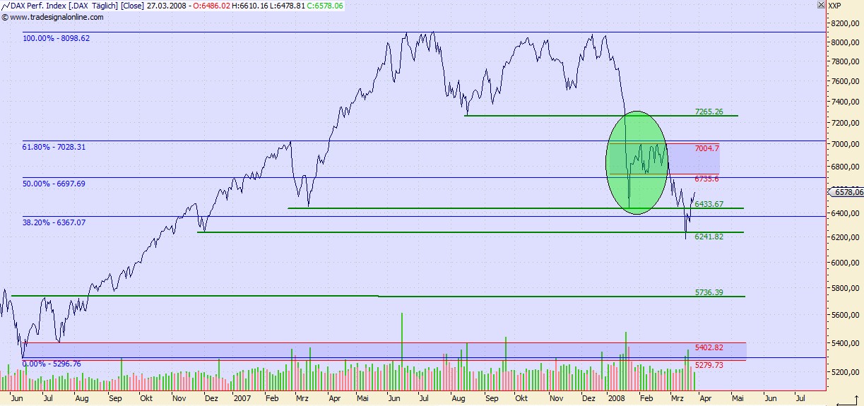 Onassis März 27, 2008 Also meine Annahme vor ein paar Tagen, das der DAX weiter fällt, ist nicht eingetreten. Aber ich denke, das es eine ähnliche Situation wie Januar/Februar (grünes Oval) ergeben könnte. D.h. ich rechne jetzt mit einer Seitwärtsbewegung und danach weiter abwärts. Deswegen hasse ich inzwischen trades, die über mehrere Tage laufen. Es ist fast nicht mehr einschätzbar, jedenfalls für mich, was der DAX macht. Onassis Diesen Beitrag teilen Link zum Beitrag