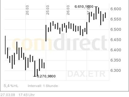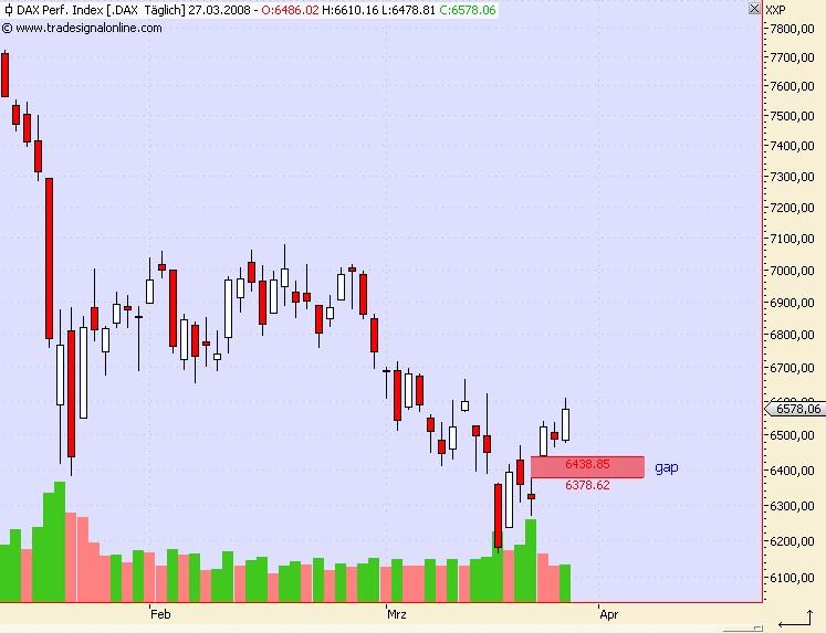 Onassis März 27, 2008 ....... da ist doch noch ´ne kurslücke vom dienstag, die es zu schließen gilt, oder? Du meinst dieses gap hier, nehme ich an: Und ja, die Mehrheit der Händler spricht davon, das ein gap geschlossen werden muss. Was aber nicht immer der Fall ist, aber meistens. Insofern rechne ich auch mit baldigen Kursen um 6.350 - 6.400. Onassis Diesen Beitrag teilen Link zum Beitrag