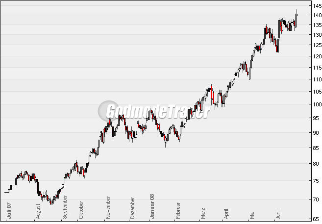 ganz klar ein hausse chart! das problem ist nur wann ist die hausse zu ende...das ist unmöglich zu beurteilen. ich empfehle langfristig short zu gehen jetzt mit der halben positionsgröße mit einem optionschein mit basis von ca. 100USD. bei weiter steigender notierung spätestens bei 160 dollar anchkaufen. so ist man auf der sicheren seitu hat eine hohe warscheinlichkeit gute gewinne zu machen.