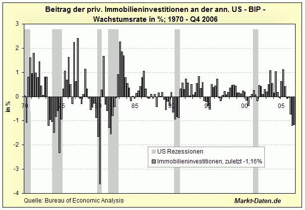Aen Januar 15, 2008 3 Gründe warum ich bearish bin: 1. Es wird im Moment immer von der günstigen Bewertung der DAX Unternehmen gesprochen. Allerdings bezieht sich das meist auf das KGV. Das KCV entspricht momentan knapp den 2000er Werten. Die Gewinne wurden aufgrund geänderter Bilanzierungsvorschriften höher dargestellt als sie nach den alten Richtlinien sein würden. Quelle: FAZ Artikel. Jetzt leider nicht mehr umsonst. (http://www.faz.net/IN/INtemplates/faznet/default.asp?tpl=common/zwischenseite.asp&dox={B3F5BF1F-F3BE-F469-DD3A-77AF55A76256}&rub={42AFB371-C831-47B7-95D8-89BB33AF8404}) 2. In der Vergangenheit hat eine Abnahme der privaten Immobilieninvestition mit vergleichbarem Ausmas immer mit ca. 1-jähriger Verzögerung zu einer Rezession in den USA geführt. Dieser Quelle zufolge ist weiters der Anteil der Immobilieninvestition am BIP gestiegen. Quelle: www.markt-daten.de 3. Naiv statistisch gesehen müsste es, wenn man natürliche Wirtschaftszyklen von 4-6 Jahren annimmt, bald wieder runtergehen. Der Aktienmarkt wird davon nicht verschont bleiben, da mMn im Moment das starke Wachstum immer als Pro-Punkt für Aktien genannt wird. Man sieht auch, dass sich die Wertentwicklung des DAX (ganz grob gesehen) in 4-6 jährigen Phasen abspielt. Wir haben jetzt gut 4 Jahre positive Renditen gehabt. Zeit für Abwechslung. Zumindest glaube ich nicht an eine "new era", in der es ständig bergauf geht. Einstellung bis heute unveraendert. War interessant zu beabachten, wie oft im letzten halben Jahr der Einfluss der Immobilienkrise von "Experten" heruntergespielt wurde. Aussagen, dass der Immobilienmarkt eine winzige Rolle fuer die Kaufkraft der Konsumenten in den USA spielt, waren und sind noch immer fuer mich einfach laecherlich (siehe schlagzeile 2 unten) Auch einige Aussagen von Bank-Vorstaenden sind im Nachhinein sehr interessant. Zum vergleich zwei schlagzeilen von heute: 1,"Citigroup Inc. posted the biggest loss in the U.S. bank's 196-year history as surging defaults on home loans forced it to write down the value of subprime-mortgage investments by $18 billion. " 2, "-- Sales at U.S. retailers unexpectedly dropped in December, capping the weakest year since 2002 and pushing the economy closer to recession. " Diesen Beitrag teilen Link zum Beitrag