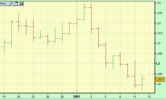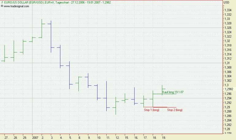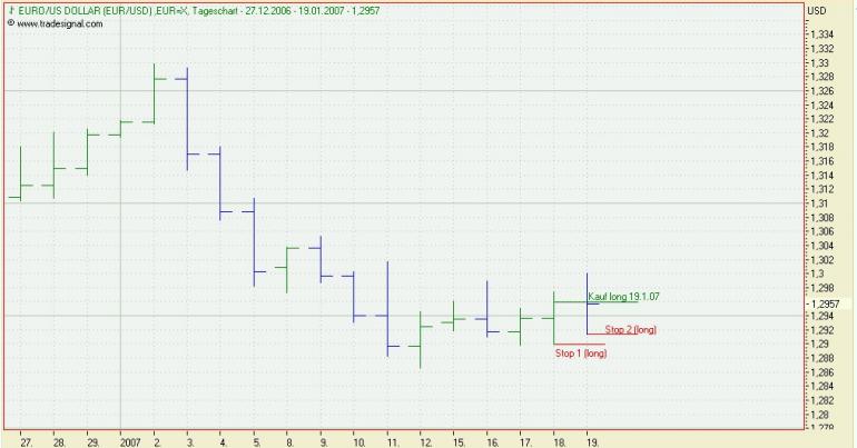Onassis Januar 17, 2007 Action: Um 1.00 Uhr wird bei tradesignal der Tag bei den Währungen geschlossen. Der close Kurs vom 16.1 liegt bei 1,2917 Der tiefste Kurs vom Tag davor lag bei 1,2919. Das heißt, das Tief wurde unterschritten und somit ein Verkaufssignal generiert. Es wird nun folgendes geschehen: Kauf bei 1,2917 Stop 1 liegt bei 1,2960 Stop 2 liegt bei 1,2989 Dann mal alles Daumen für fallende Kurse drücken. Onassis Diesen Beitrag teilen Link zum Beitrag