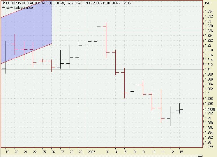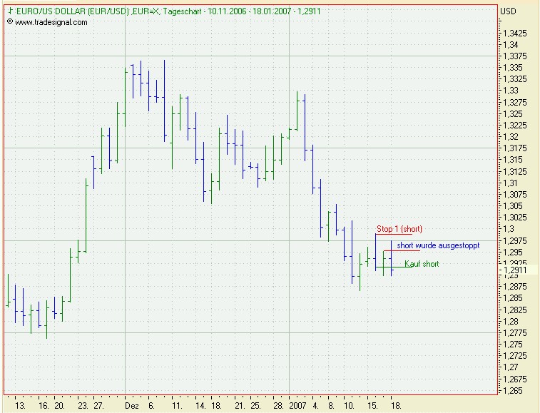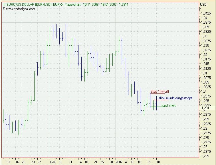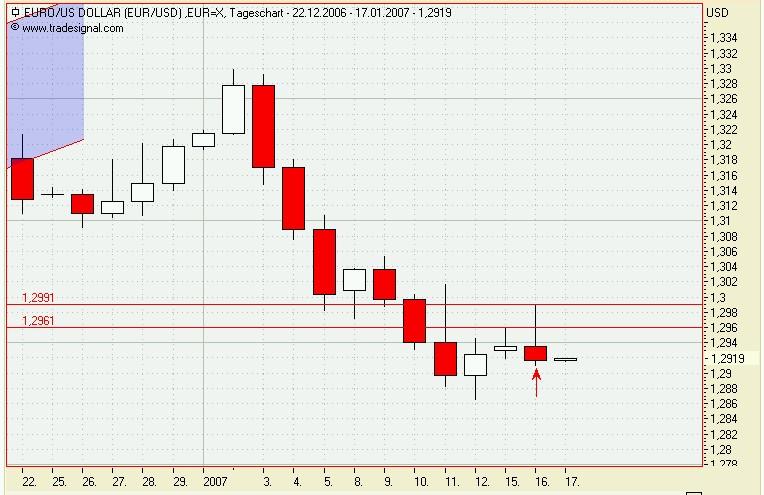 Onassis Januar 16, 2007 Bisher wurde noch kein Signal generiert. Sollte der EUR/USD aber heute nacht so schließen, wie er momentan steht, dann würde ein Verkaufssignal entstehen, da der close Kurs von heute unter dem Tief von gestern liegt. Onassis Diesen Beitrag teilen Link zum Beitrag
