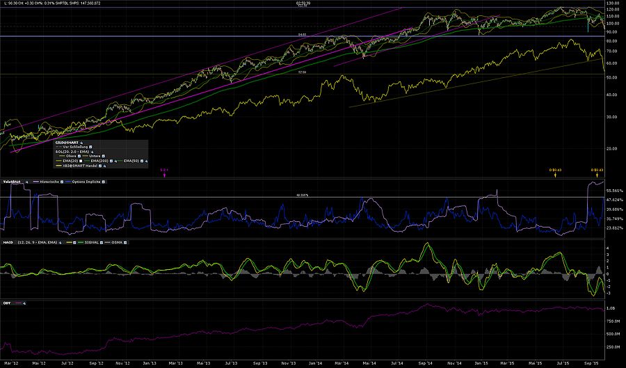 Cai Shen September 30, 2015 Ich warte noch, rückwirkend betrachtet ist der primäre Aufwärtstrend nach 2,5 Jahren in meiner Betrachtung seit Sept'14 in eine Seitwärtsbewegung übergegangen, unter 85 USD bestätigt sich endgültig ein Abwärtstrend. Technisch ist das Bild eher eine Katastrophe: Vola auf Mehrjahreshoch, MACD auf Mehrjahrestief, On-Balance-Volume als Indikator für Kauf- oder Verkaufsdruck ebenfalls in der Abwärtsbewegung. Der Gesamtmarkt bewegt sich seit fast einem Monat planlos, im Segment Biotech (gelbe Linie) entwickelt sich eher ein Abwärtstrend, so kurz vor der Berichtssaison Q3'15 erwarte ich keine signifikanten Änderungen der Gesamtsituation. Fundamental muss nur jemand die Hillary mal von der Bühne zerren, die erneute Preisdiskussion in den Medien bekommt dem Sektor überhaupt nicht. Dann zählen auch wieder Umsätze, Profitabilität und Shareholder return. Bei Shire PLC hats geschlagene 1,5 Jahre gedauert, bis aus einem hervorragenden Unternehmen auch ein lohnendes Investment geworden ist - schlussendlich auch nur wegen der Übernahmegerüchte. Diesen Beitrag teilen Link zum Beitrag