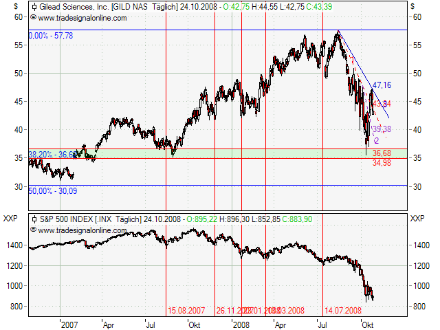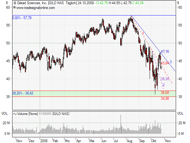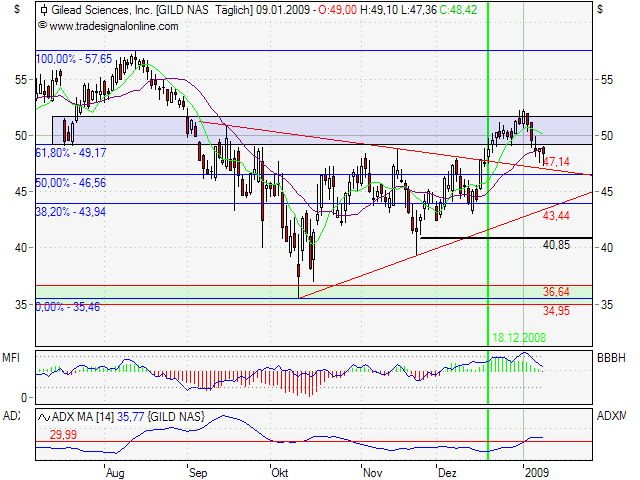 Da ich, rein diskretionär gesehen, von der anlaufenden Berichtsaison nichts Gutes für die Aktienmärkte erwarte, rechne ich eher mit einer Abwärts-, als mit Aufwärtsbewegung bei GILD. Die Akteure praktizieren zur Zeit "Sell the Rally" und kaufen nicht in die steigenden Kurse hinein.