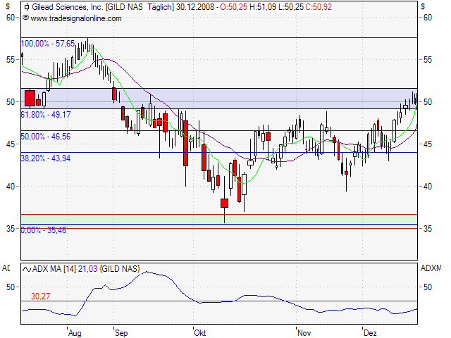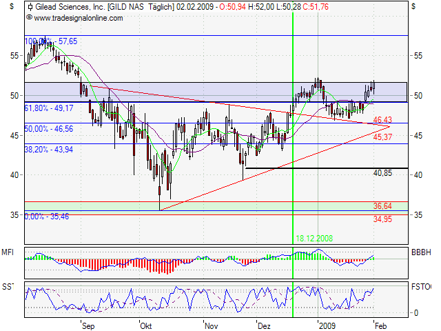 Es bleibt abzuwarten, ob GILD die "Volume-Zone" zurückerobern oder zumindest das 50er Retracement verteidigen kann. Entgegen meinem oben angegebenen Stop-Buy bei 51,80$, hatte ich noch nicht nachgekauft, da ich nachträglich das Hoch vom 2.1. (52,35$) als Filter eingebaut hatte.
